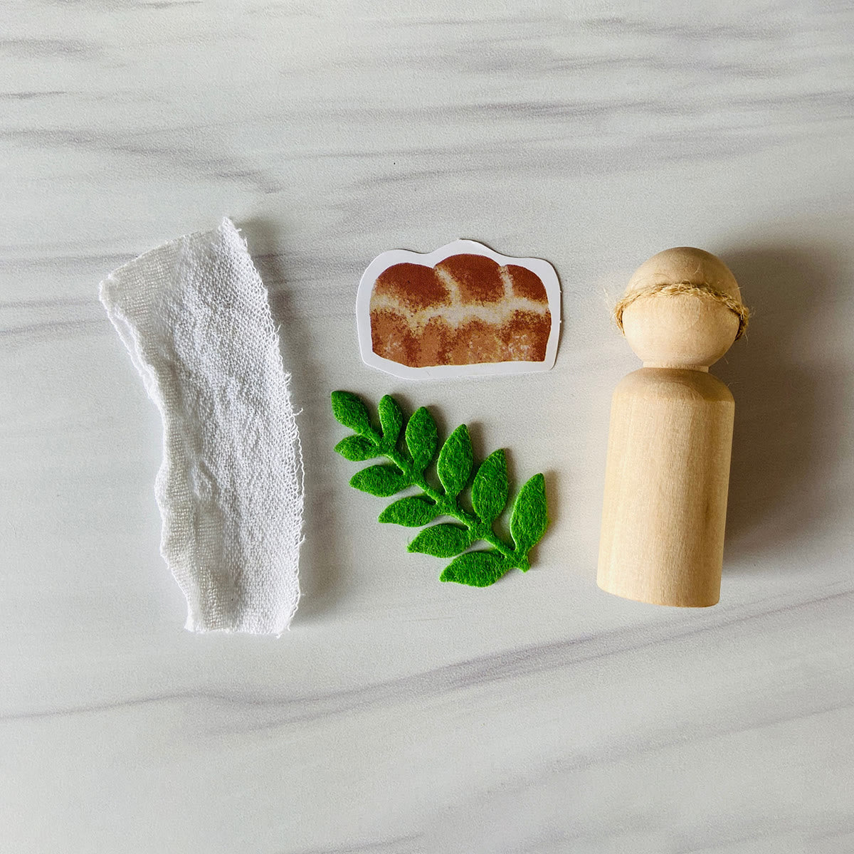 - Include: scatola (3,5 x 3,5 x 1 pollice), bambola di legno (2 3/8 pollici), ramo di palma in feltro, panno di cotone bianco, corda di canapa, pagnotta di pane ritagliata, 7 carte