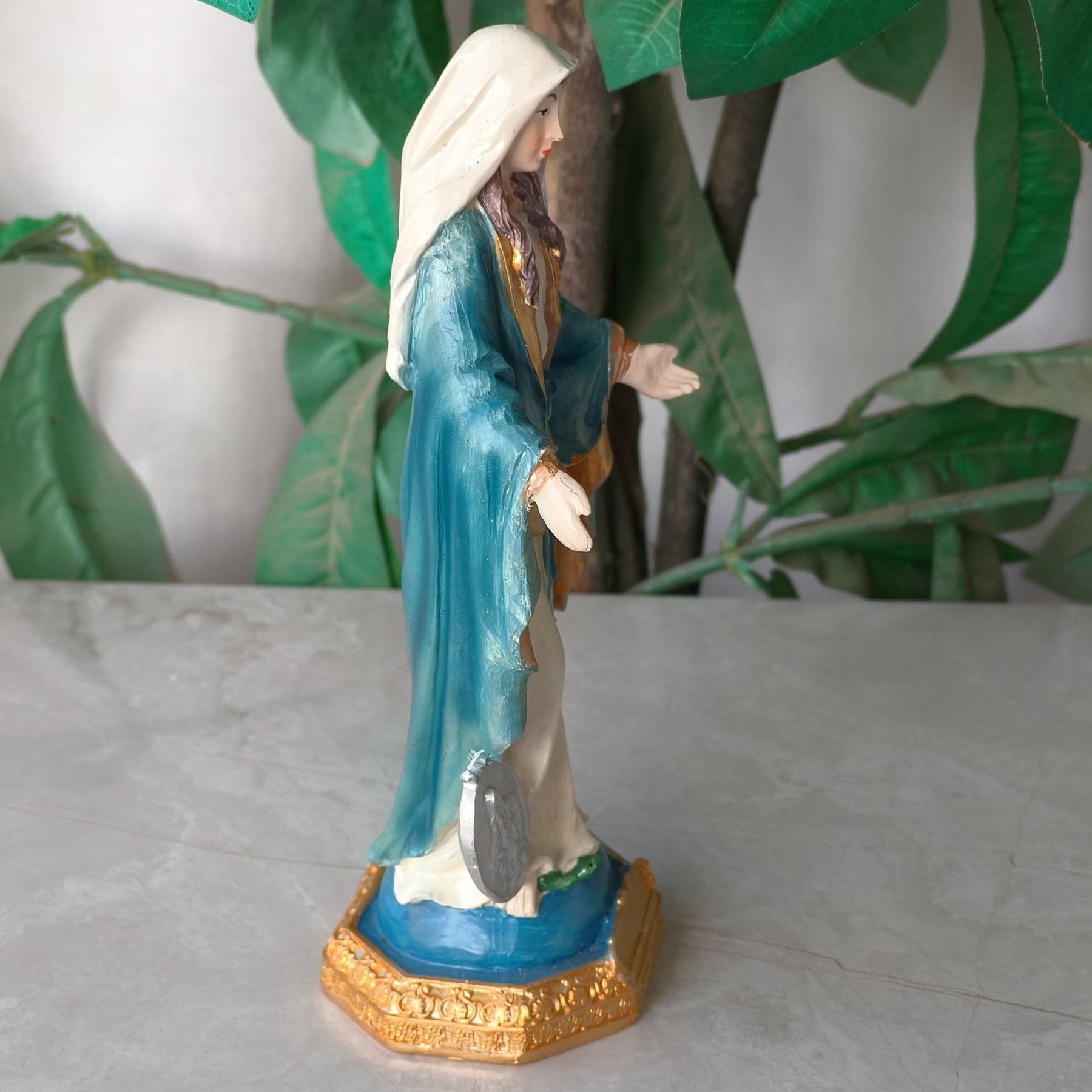 Celebra la grazia divina e la serenità della devozione spirituale con la nostra decorazione da tavolo raffigurante la Medaglia Miracolosa della Vergine Maria. Questa squisita statuetta cattura magnificamente la sacra presenza della Vergine Maria, creando un'atmosfera di pace e riflessione in qualsiasi spazio. - Artigianato squisito