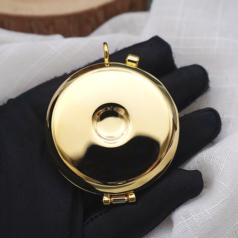 Questa pisside placcata in oro, splendidamente realizzata, è pensata per sacerdoti, diaconi e ministri eucaristici che trasportano l'ostia consacrata per la Messa o visitano i malati. Combinando funzionalità e tradizione sacra, questa pisside è un contenitore essenziale per la reverenza nella gestione della Santa Eucaristia.