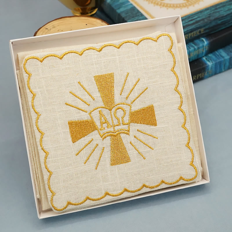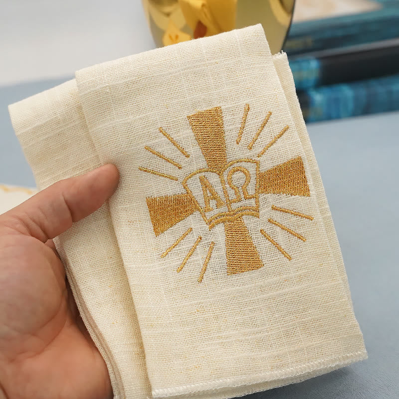 1 Asciugamano Lavabo: ricamato con il simbolo Alfa e Omega, utilizzato durante il rituale del lavabo per purificare le mani del sacerdote, a simboleggiare la prontezza a compiere i doveri sacri.