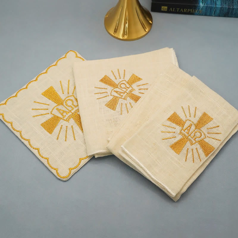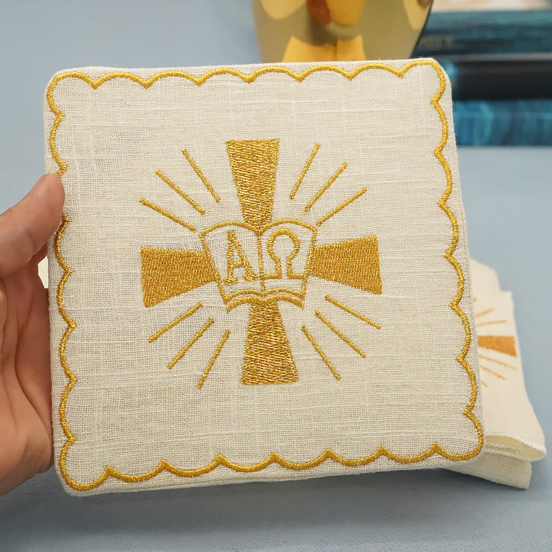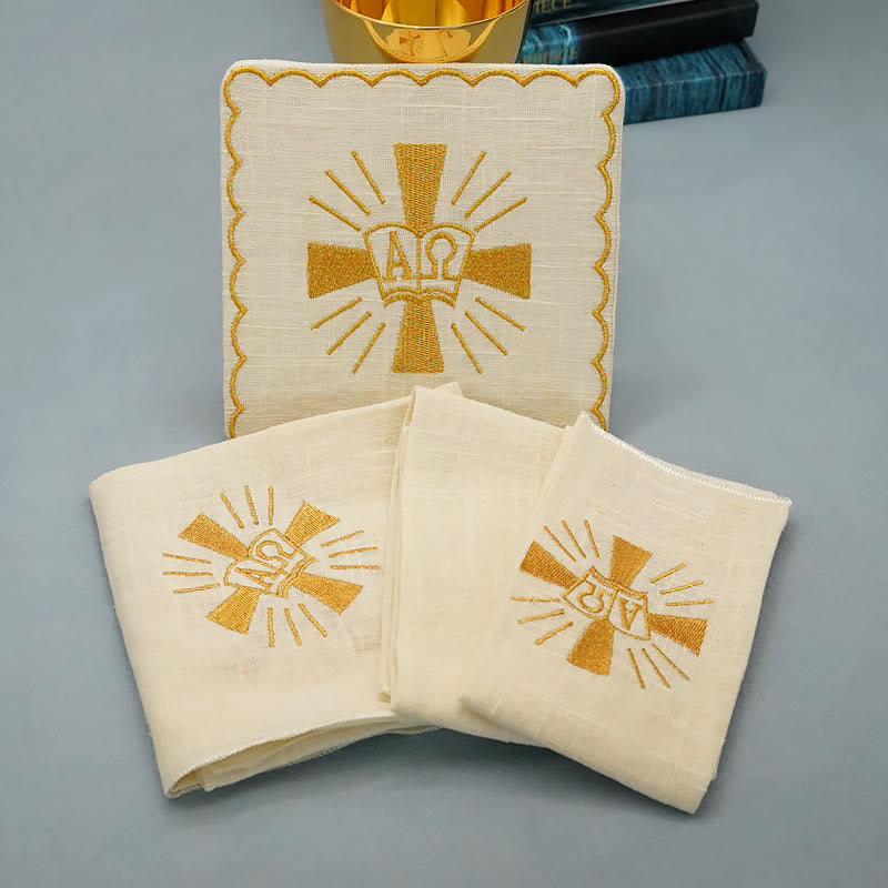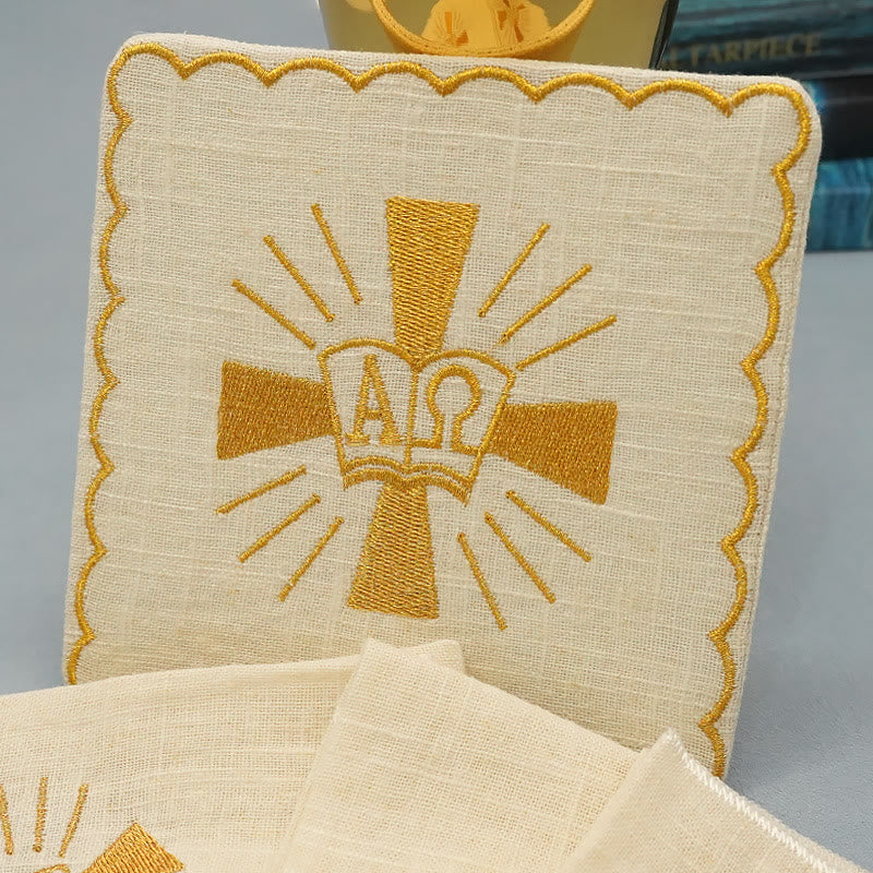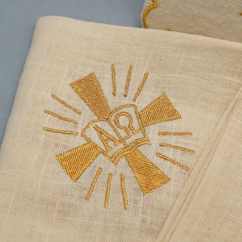 Elegante design ricamato: ogni pezzo di questo set presenta un accattivante simbolo dorato dell'Alfa e dell'Omega all'interno di una croce luminosa, che rappresenta Cristo come l'Eterno. L'intricato ricamo ne sottolinea il significato sacro e dona un tocco di divina eleganza al tuo altare.