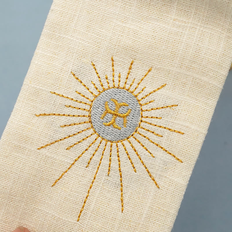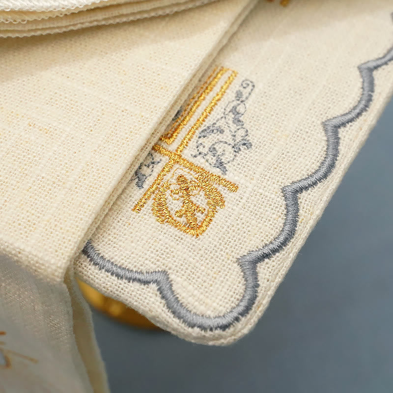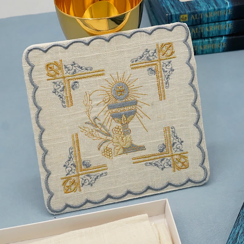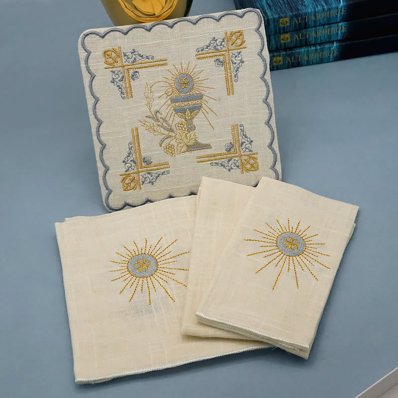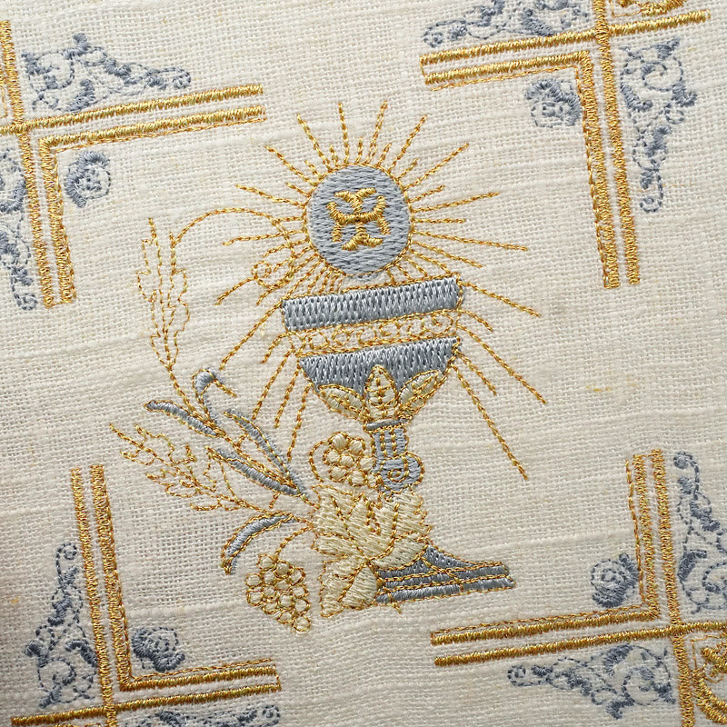 Ricami intricati: ogni pezzo di questo set è impreziosito da delicati ricami, raffiguranti il Santo Calice e i simboli eucaristici. I fili d'oro e d'argento creano un disegno radioso che riflette riverenza e devozione.