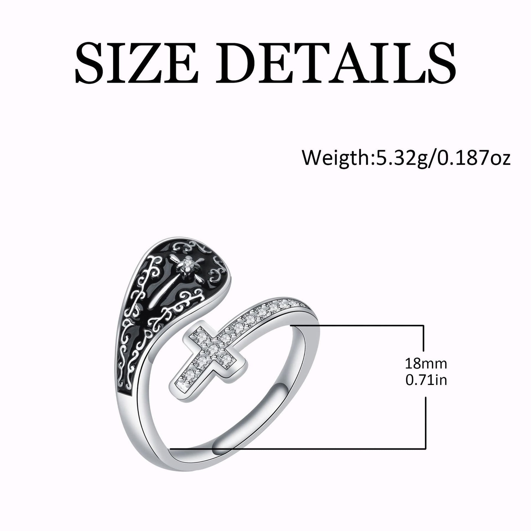 Questo anello artigianale regolabile presenta una brillante croce tempestata di cristalli e intricate incisioni di ispirazione barocca su un intarsio nero intenso. Il suo design aperto offre comfort ed eleganza per l'uso quotidiano. - Realizzato con significato
