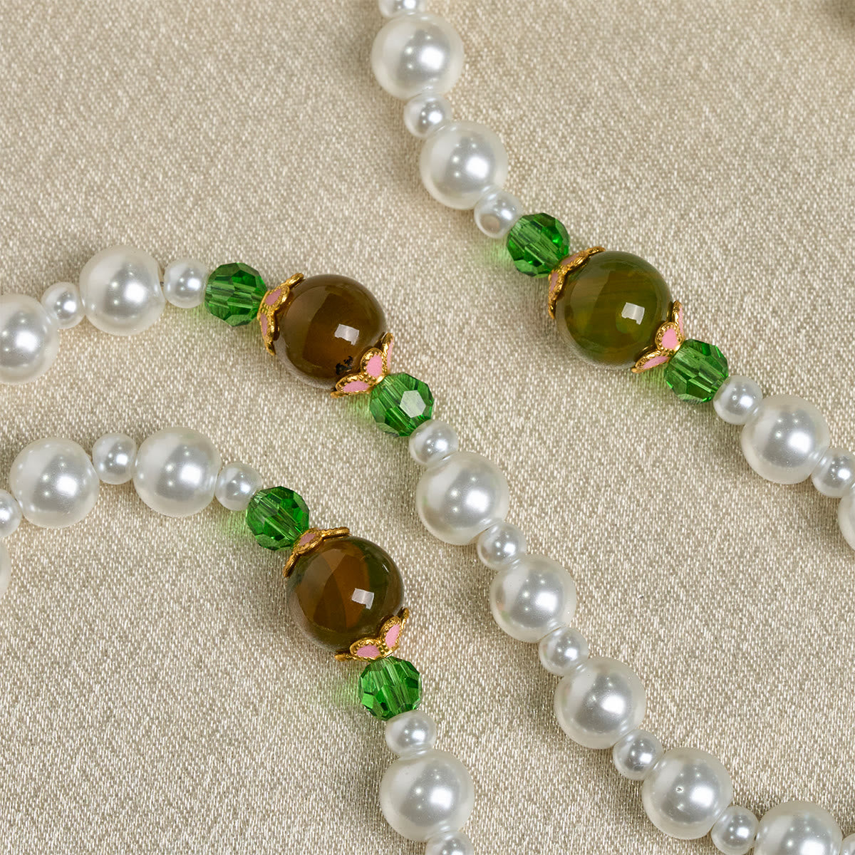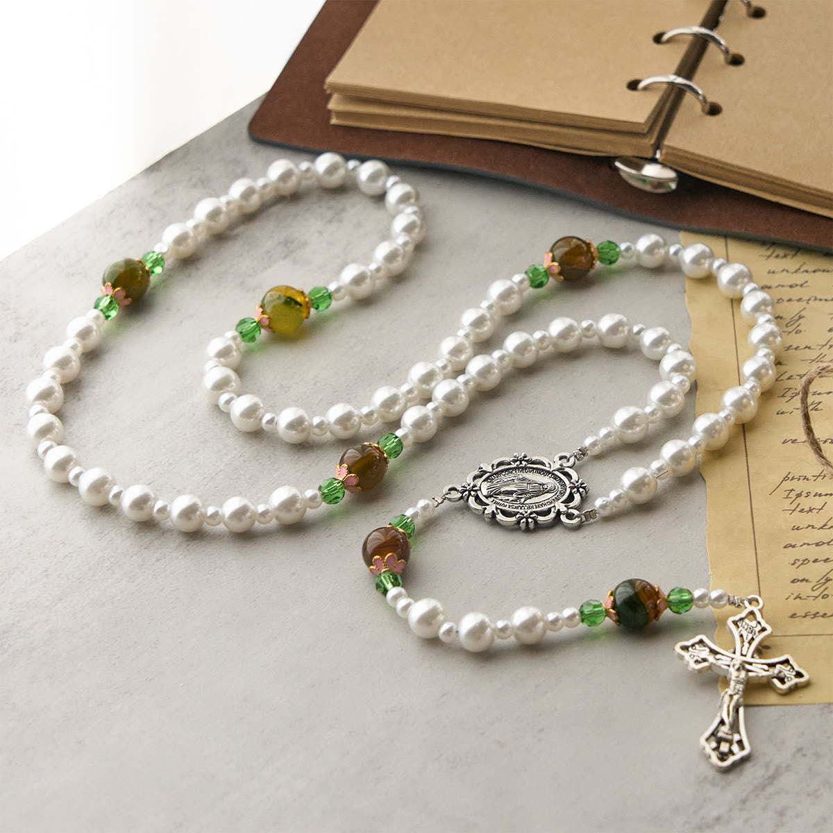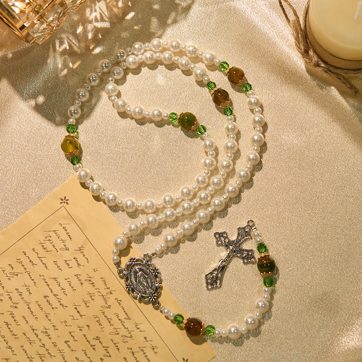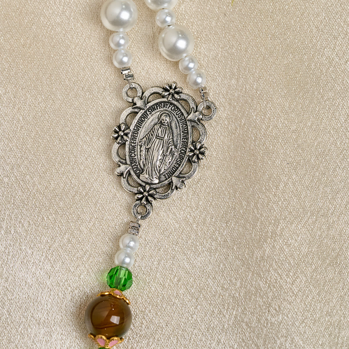 Questo elegante rosario è caratterizzato da un'armoniosa combinazione di morbide perle bianche, delicate perle rosa e rinfrescanti accenti verdi, creando un design di ispirazione floreale che riflette purezza, speranza e rinnovamento. - La presenza amorevole della Madonna