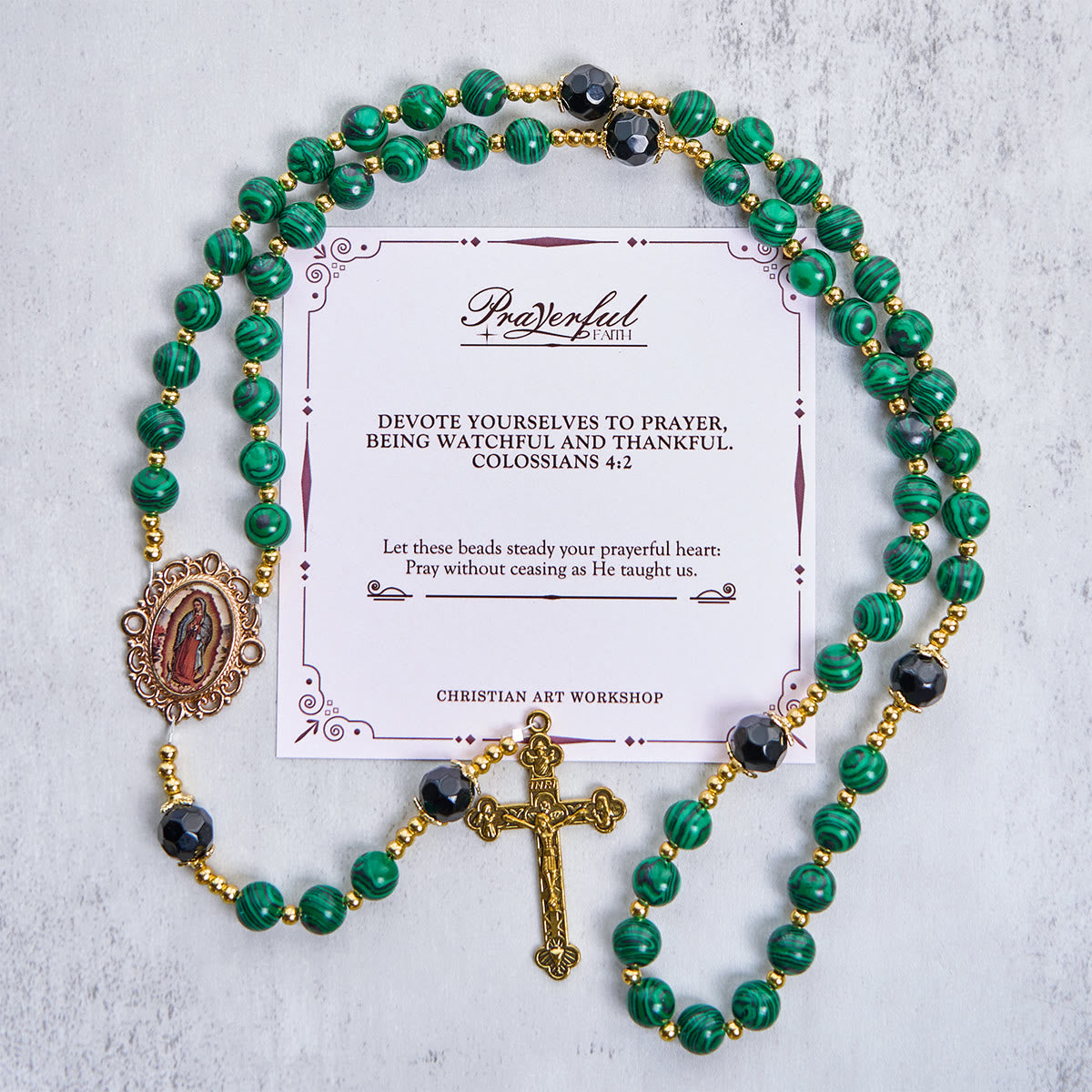 Rosario liscio in malachite verde con crocifisso e medaglia miracolosa