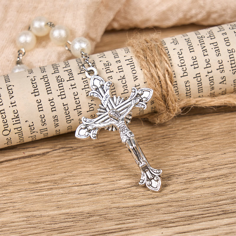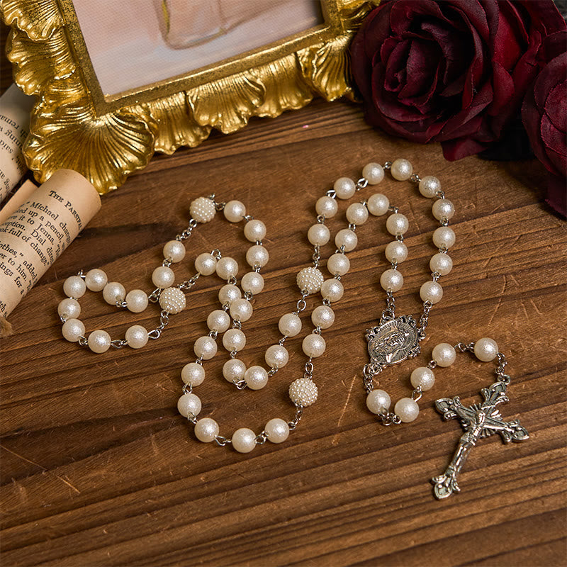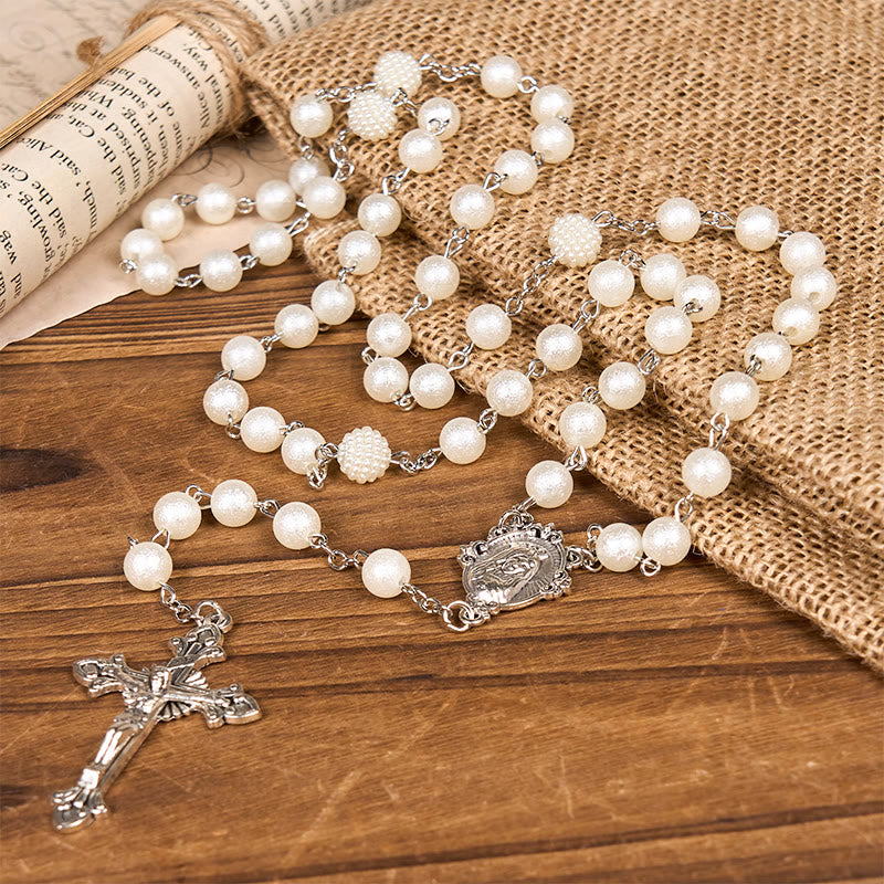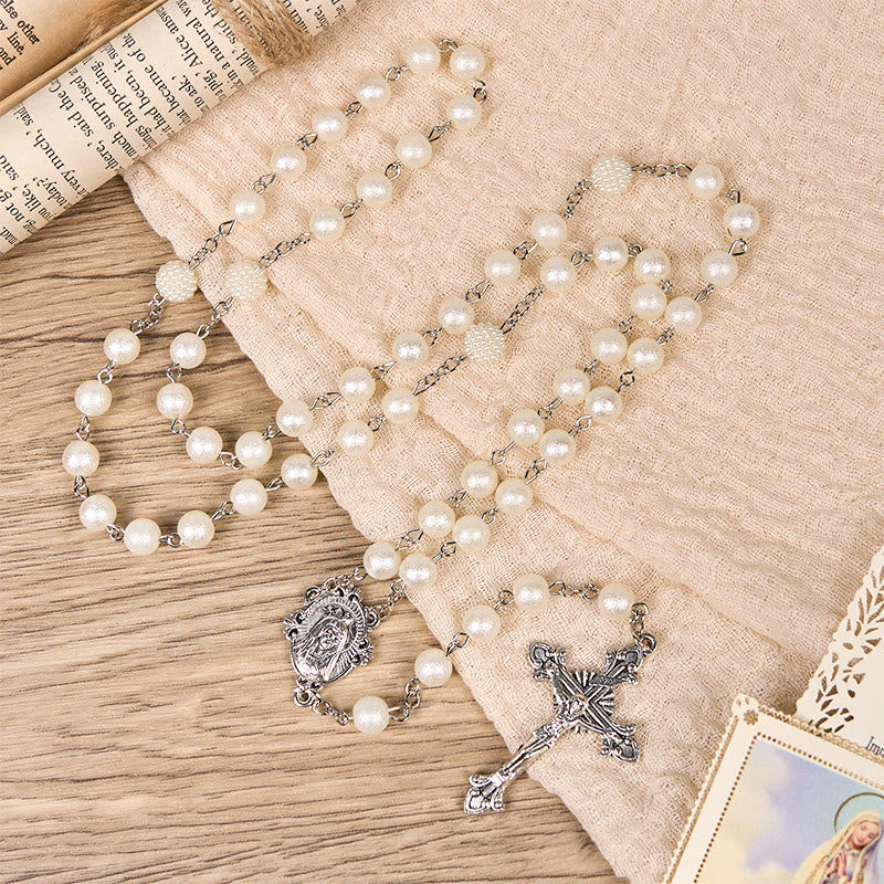 Rosario con medaglia della Madonna e crocifisso in perle rotonde in acrilico bianco da 8 mm