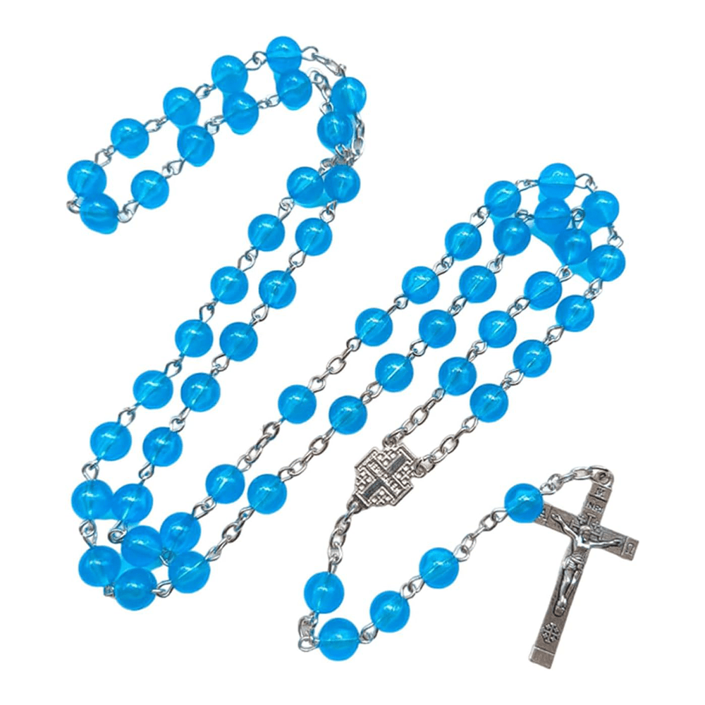 Rosario con catena in lega acrilica blu rotonda da 8 mm e medaglia di Gerusalemme e crocifisso