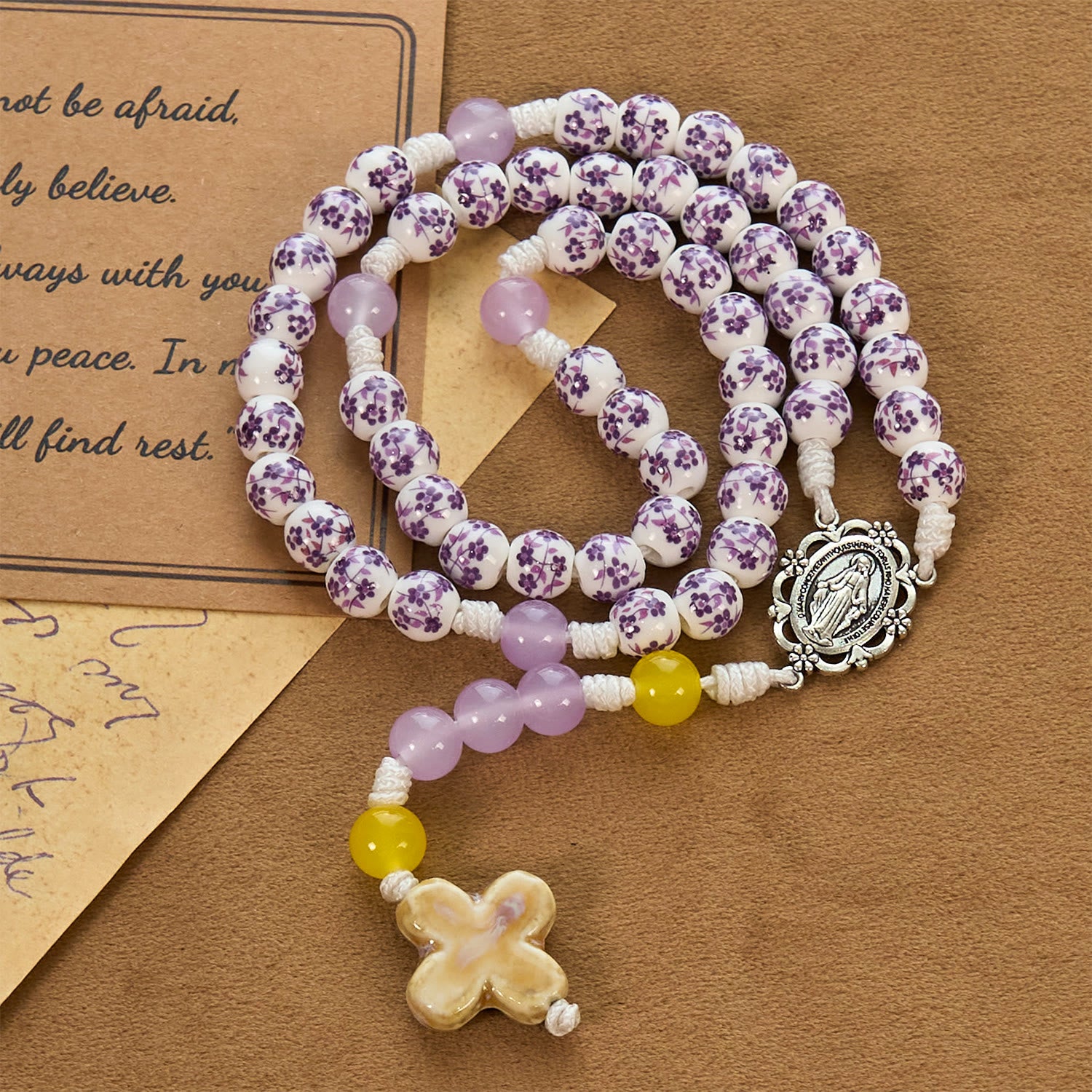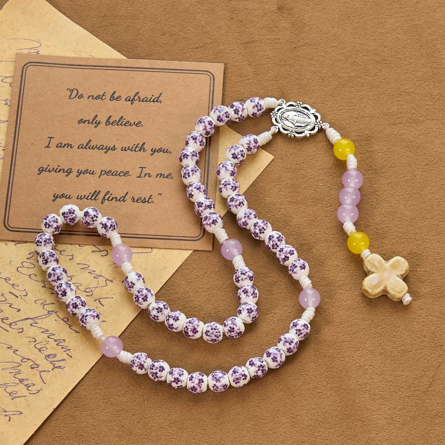 Ogni perla di ceramica da 8 mm, decorata con fiori, è una testimonianza della bellezza della creazione e del divino. I delicati motivi floreali sulle perle possono ricordarci il Giardino dell'Eden, un luogo di purezza e amore divino. Tenendo in mano queste perle durante la preghiera, vi connettete con il mondo naturale che Dio ha creato con tanto amore e con il regno spirituale dove abbonda la Sua grazia. - Un simbolo di devozione e protezione