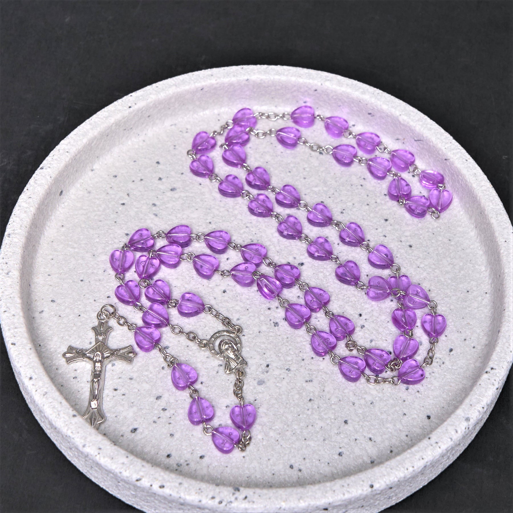 Regala questo splendido rosario a forma di cuore color lavanda a una persona speciale nella tua vita. Perfetto per sacramenti come battesimi, cresime o come presenza confortante nei momenti difficili, è un promemoria di fede e amore. - Approfondisci il tuo viaggio spirituale