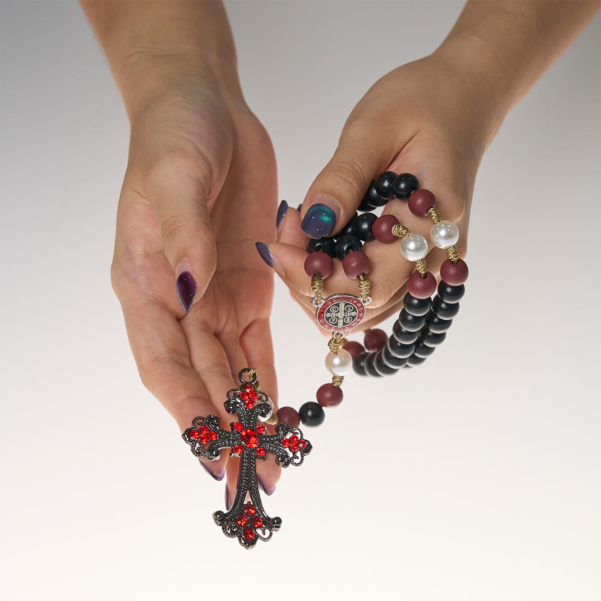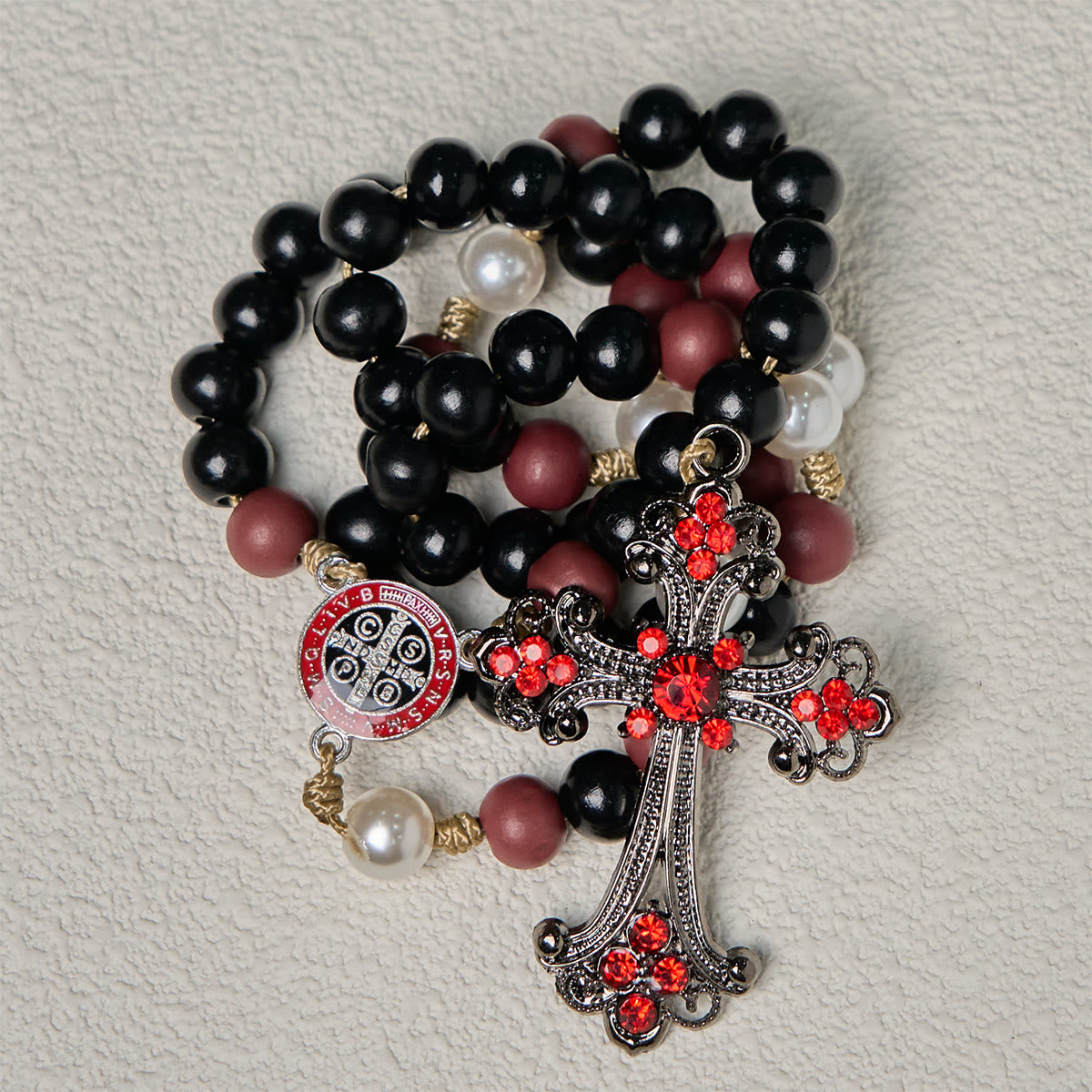 Rosario devozionale nero e rosso con benedizione di San Benedetto e croce rossa decorata