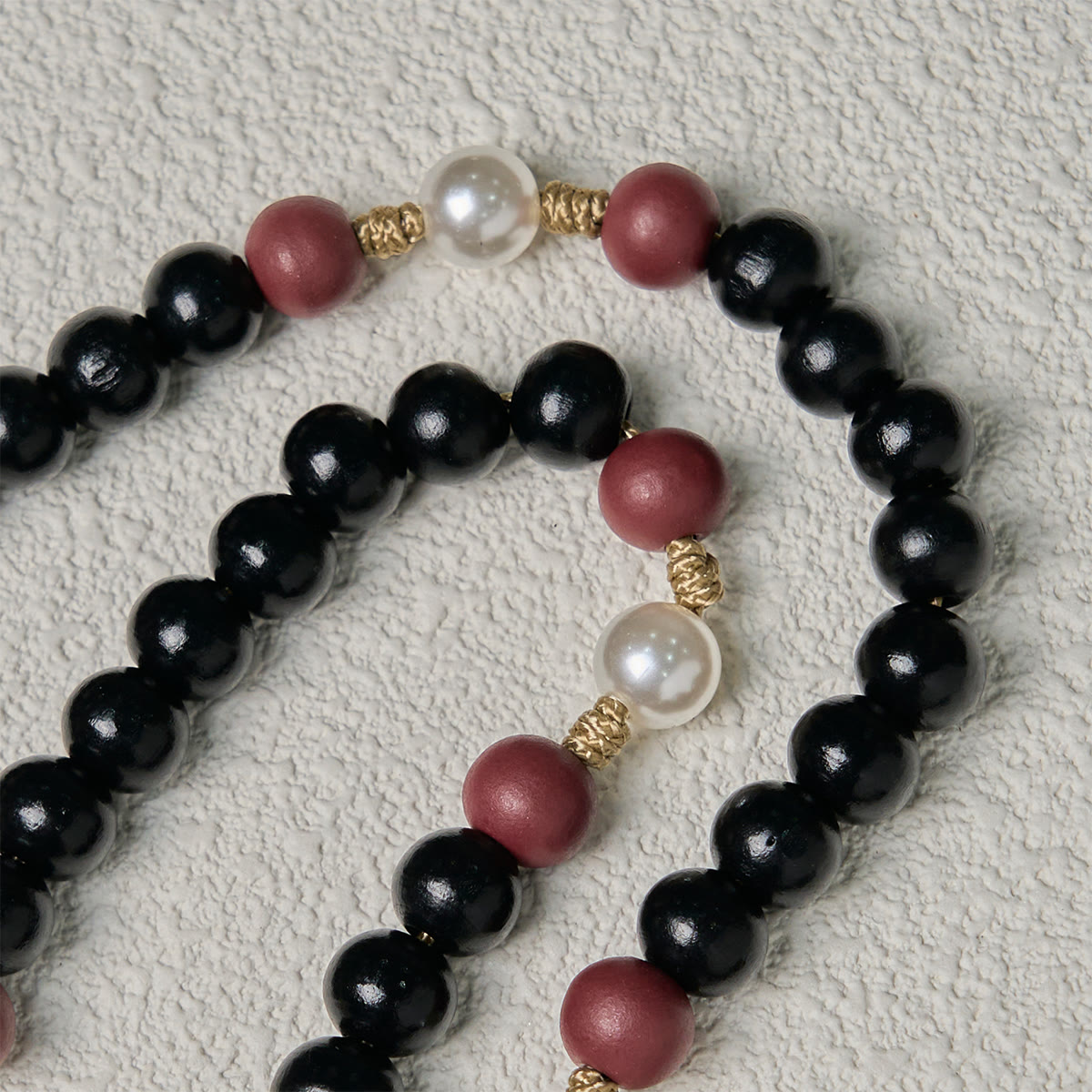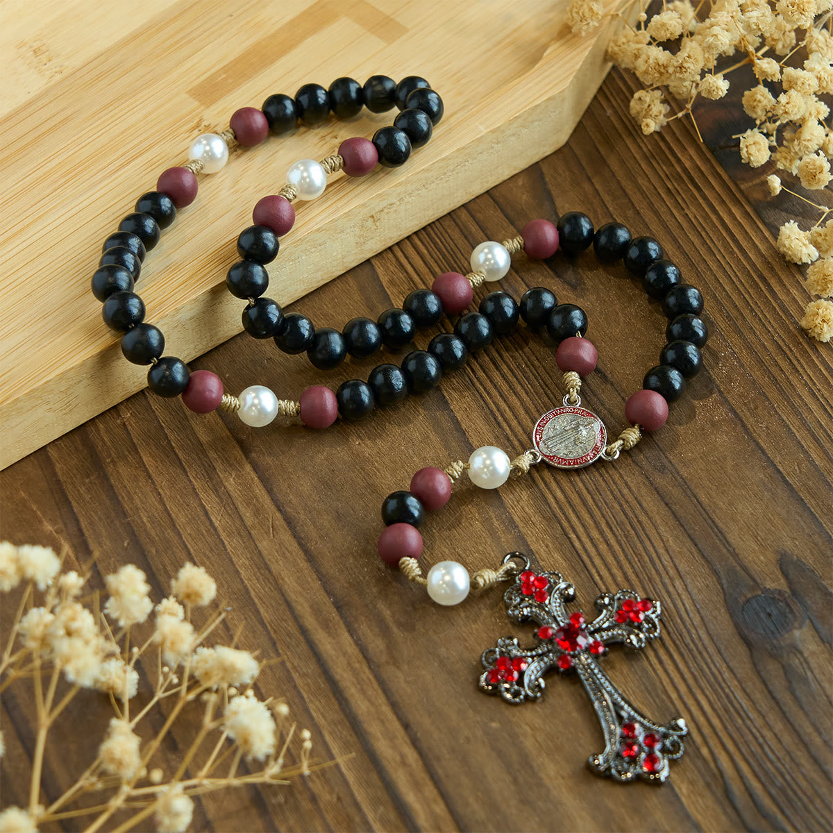 Questo straordinario rosario è caratterizzato da una tavolozza audace di nero intenso, rosso cremisi e bianco perla: colori che evocano potere spirituale, sacrificio e purezza divina.
