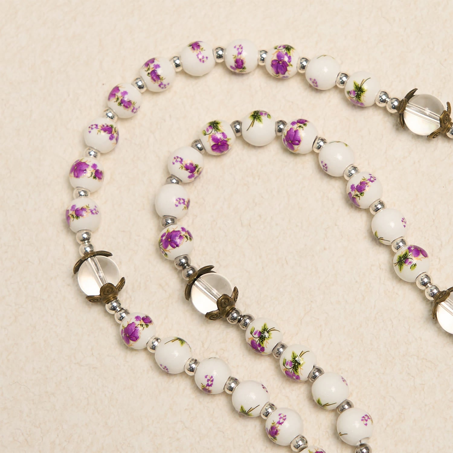 I grani del rosario sono uno spettacolo da vedere. Di un bianco candido, sono delicatamente dipinti a mano con motivi floreali viola, un'armoniosa fusione di bellezza naturale e arte divina. Tra di essi, grani trasparenti e scintillanti catturano la luce, aggiungendo un tocco di celestiale brillantezza. L'elaborato crocifisso, elemento centrale, è finemente lavorato per raffigurare il sacrificio di Gesù Cristo, un toccante ricordo del Suo amore e della Sua redenzione. Gli accenti metallici anticati conferiscono un'aria di venerazione senza tempo.