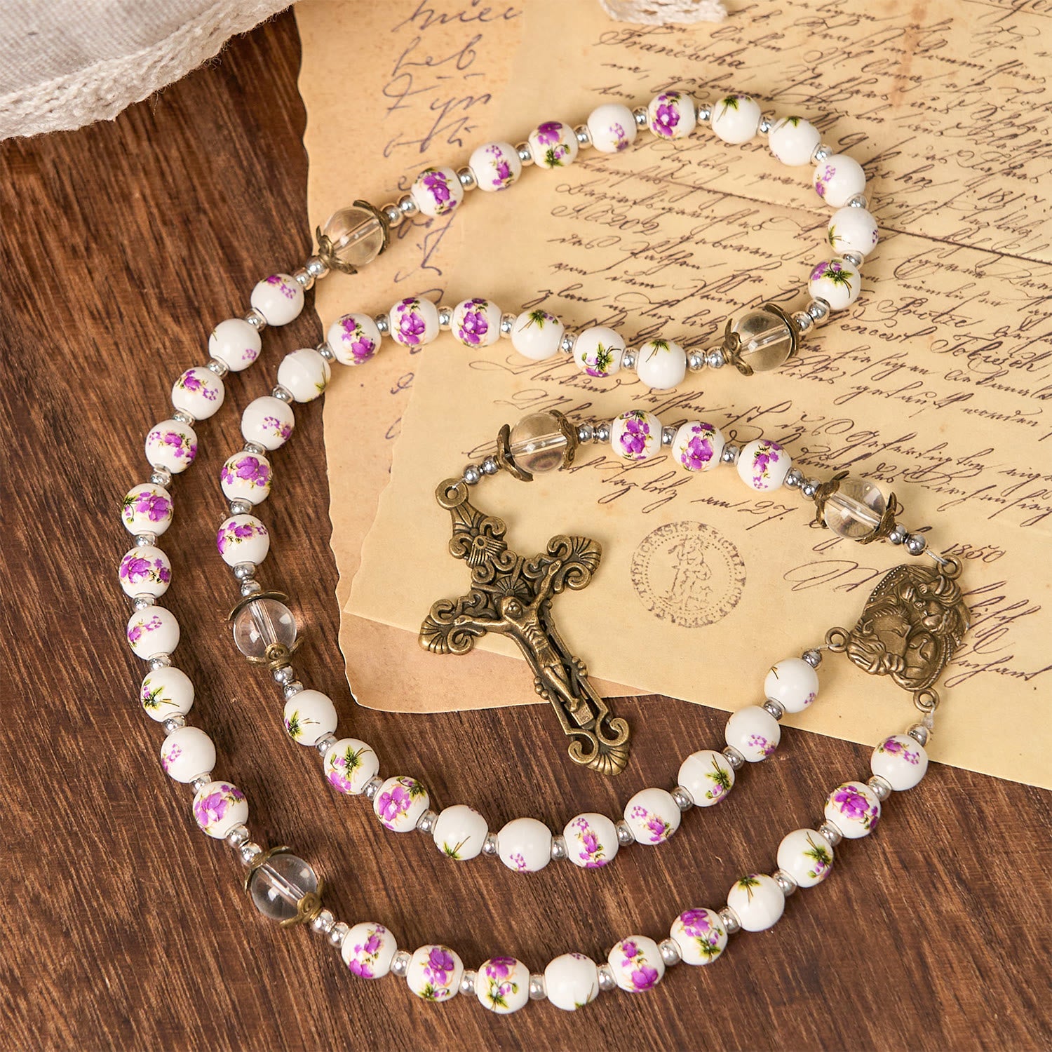 Rosario ispirato alla viola fatto a mano: un artigianato celeste con perle di porcellana floreale viola