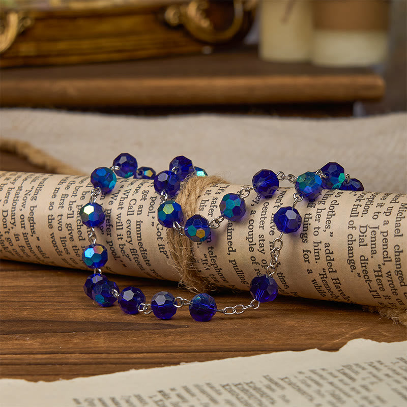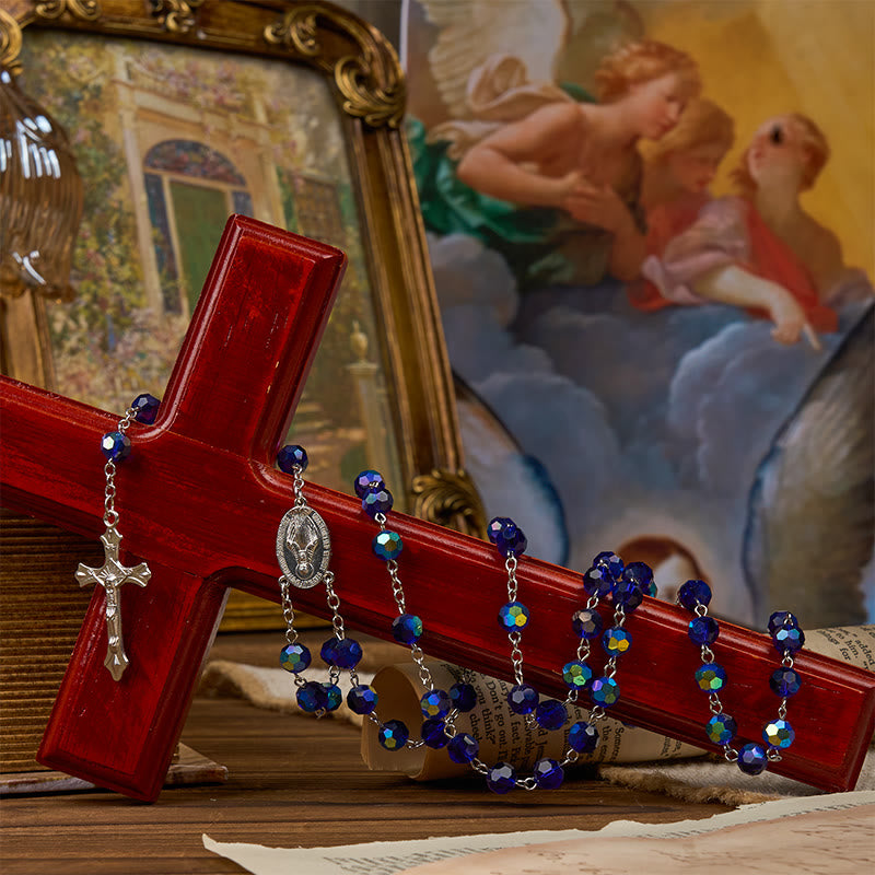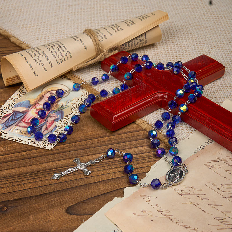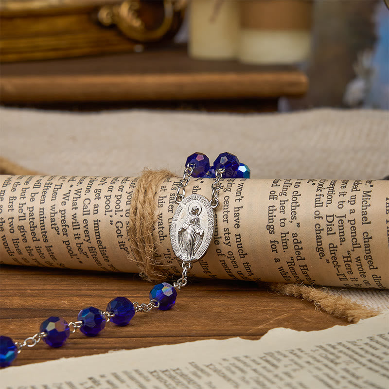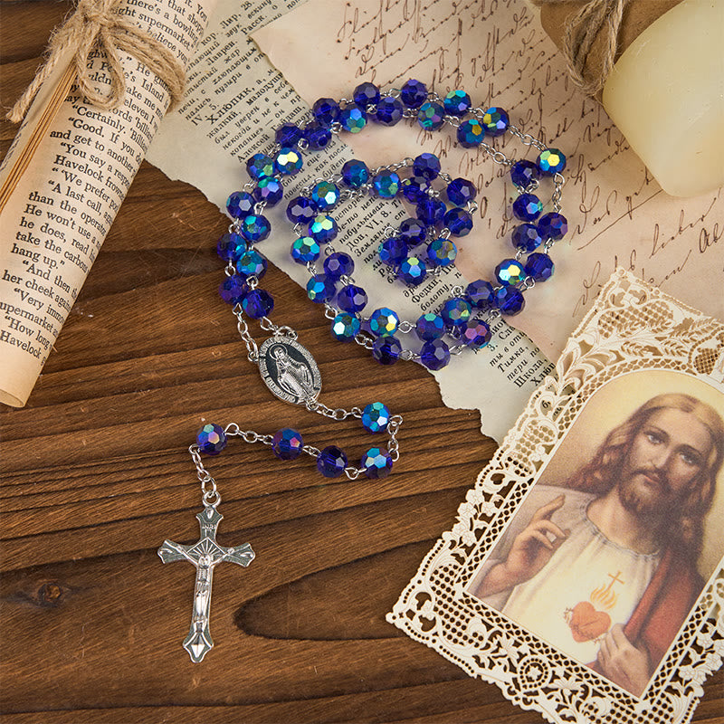 Rosario con medaglia miracolosa e crocifisso in perle rotonde di vetro blu scintillante da 8 mm