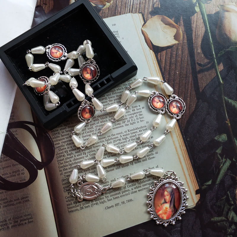 Christianartworkshop Rosario con catena in lega di perle bianche a forma di goccia del Cuore Immacolato di Maria da 5*10 mm - image 1