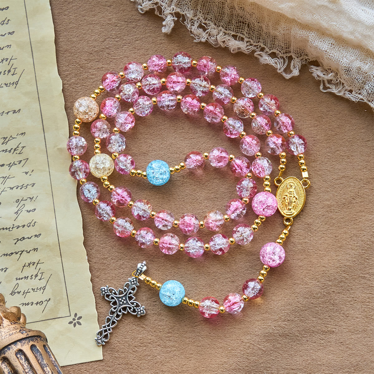 Con perle di vetro craquelé da 8 mm in rosa tenue e blu sereno, questo rosario risplende come una promessa celeste. Ogni perla riflette misericordia, amore e la forza silenziosa della fede, brillando di una luce che ispira speranza. - La tenera protezione della Madonna