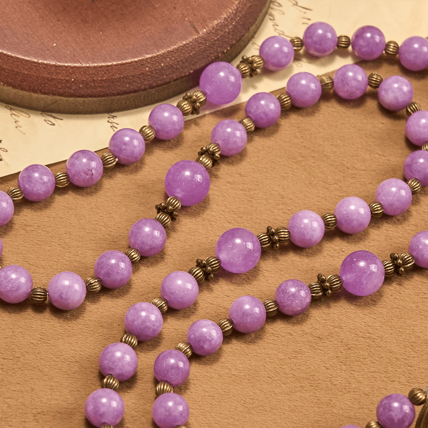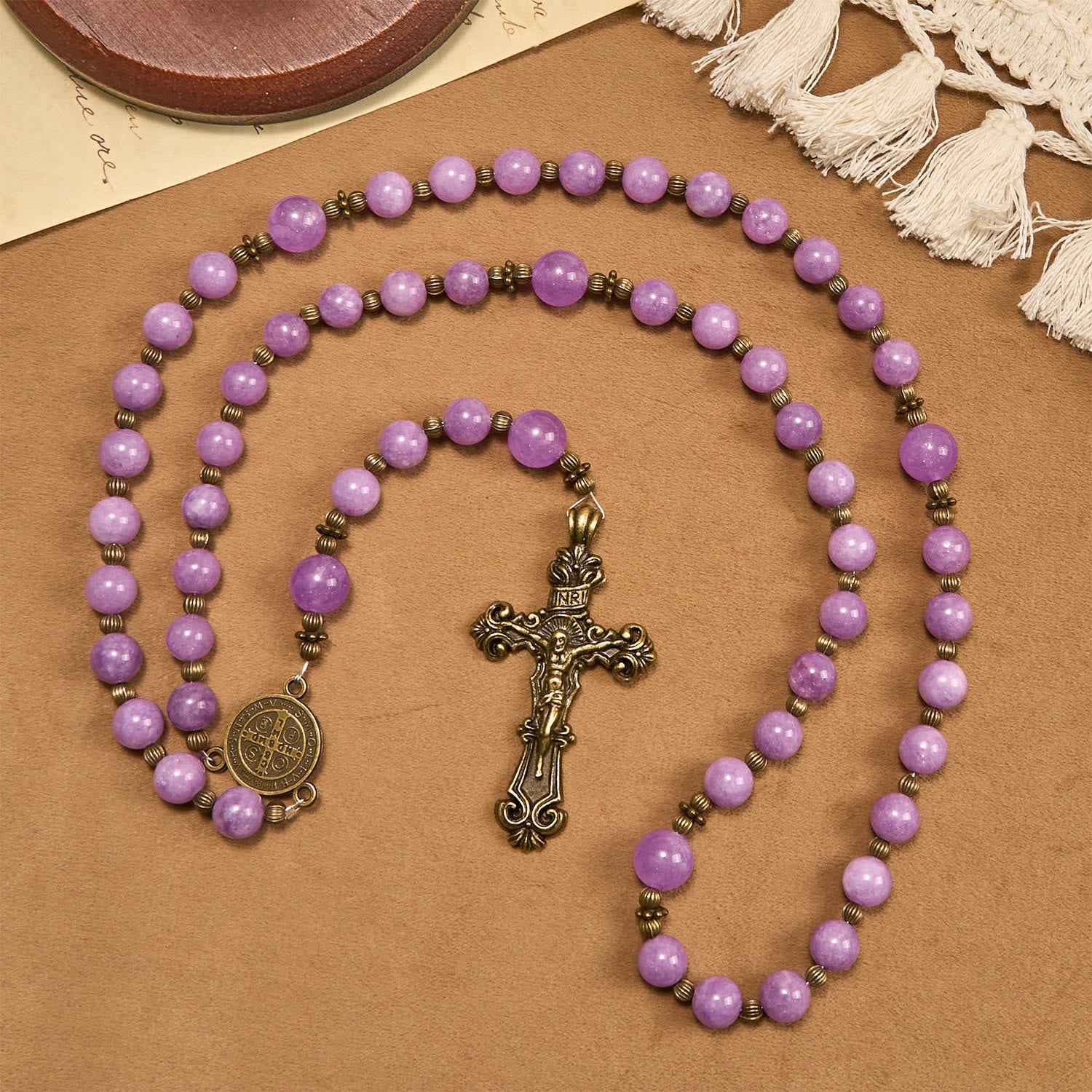 Questo rosario è un capolavoro di eleganza spirituale. I grani di calcedonio color granato viola, infilati con cura, irradiano un delicato e regale splendore, come un'aura sacra di fede. Il crocifisso e la medaglia di San Benedetto, realizzati con intricate lavorazioni in metallo, incarnano vividamente simboli spirituali. Il crocifisso raffigura il sacrificio di Gesù, mentre la medaglia di San Benedetto rappresenta la grazia protettiva. Ogni grano ed emblema racchiude un profondo significato religioso, una splendida traccia di fede che connette chi lo indossa al regno sacro. - Selezione meticolosa, qualità duratura
