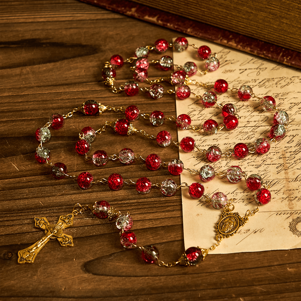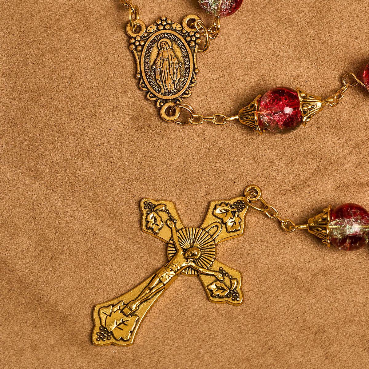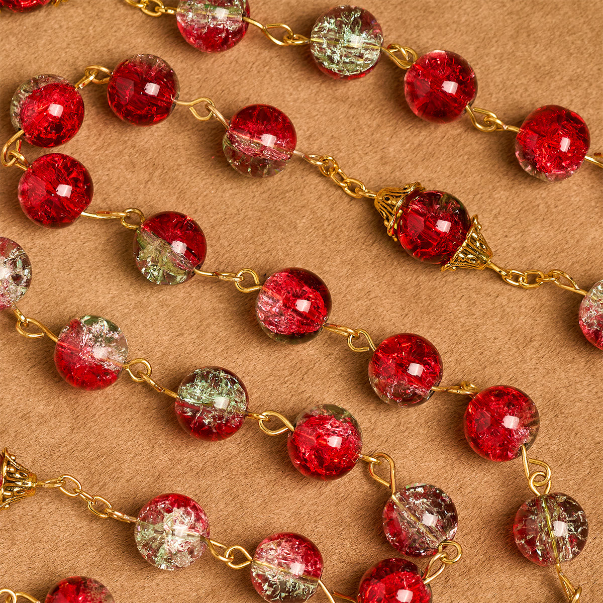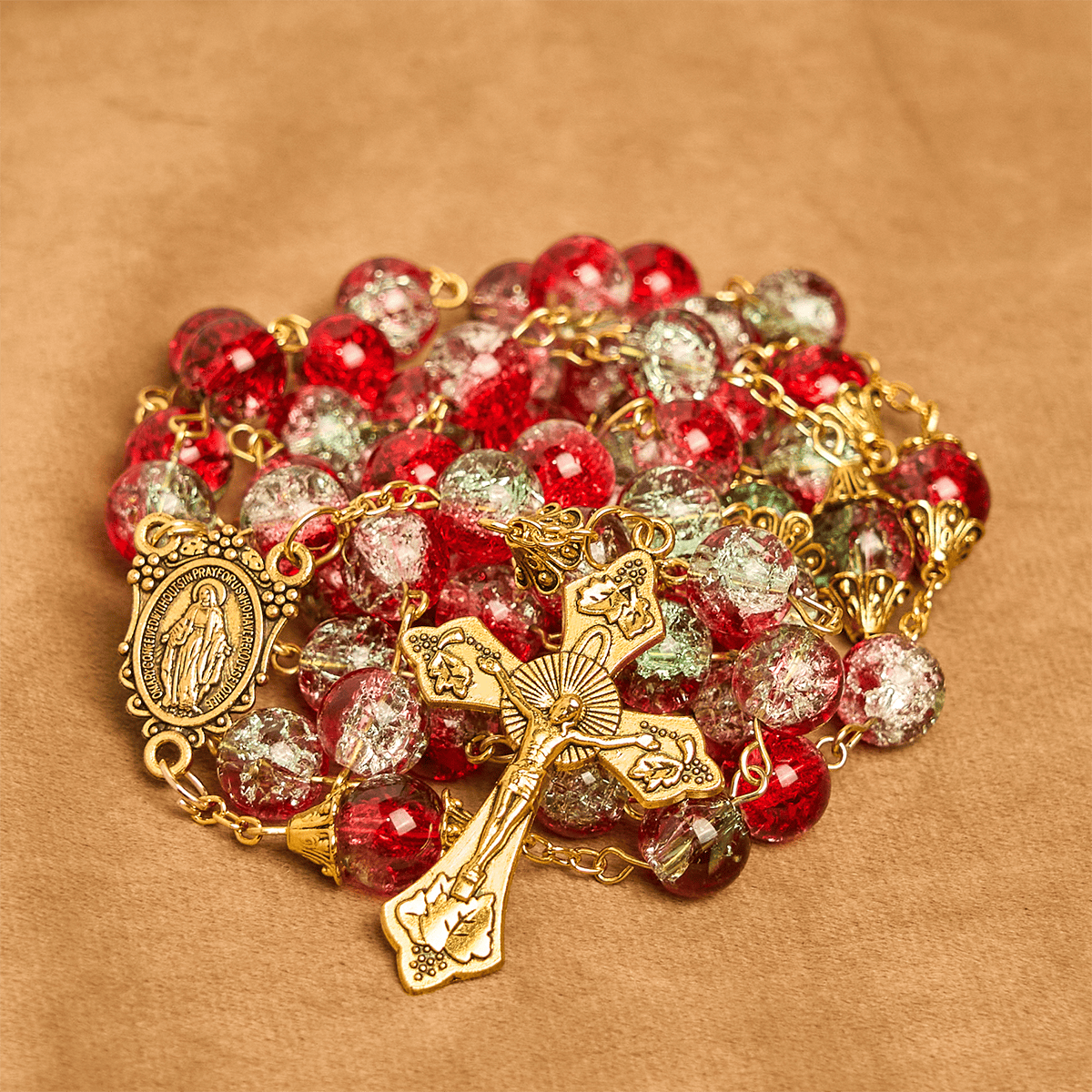 Decorato con perline rosse e verdi traslucide (che catturano lo spirito vibrante del Natale), un crocifisso dorato finemente lavorato e raffinati elementi metallici in stile vintage (tra cui la medaglia della Madonna), ogni componente fonde il calore delle feste con una spiritualità reverente. - Devozione intrecciata con design natalizio e vintage