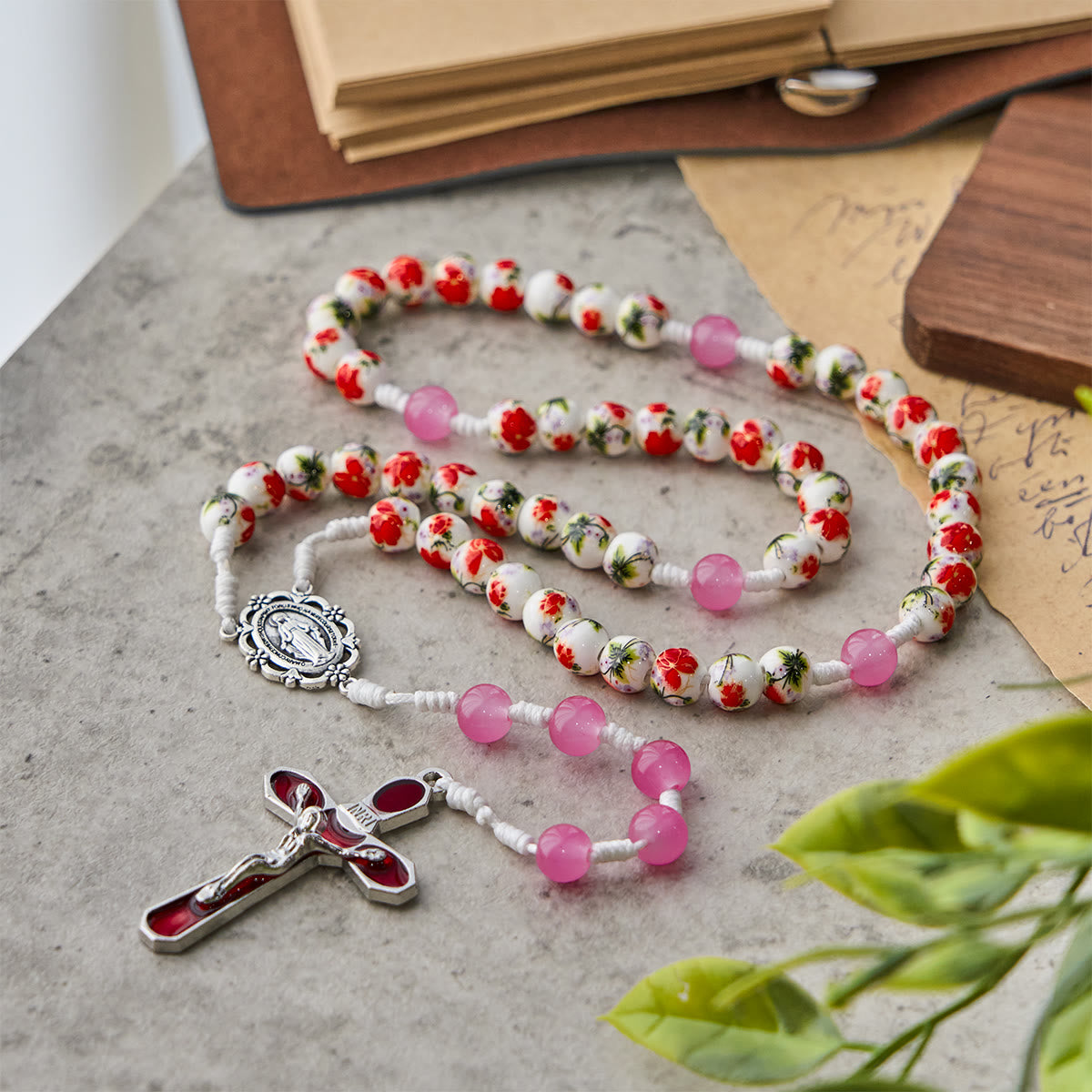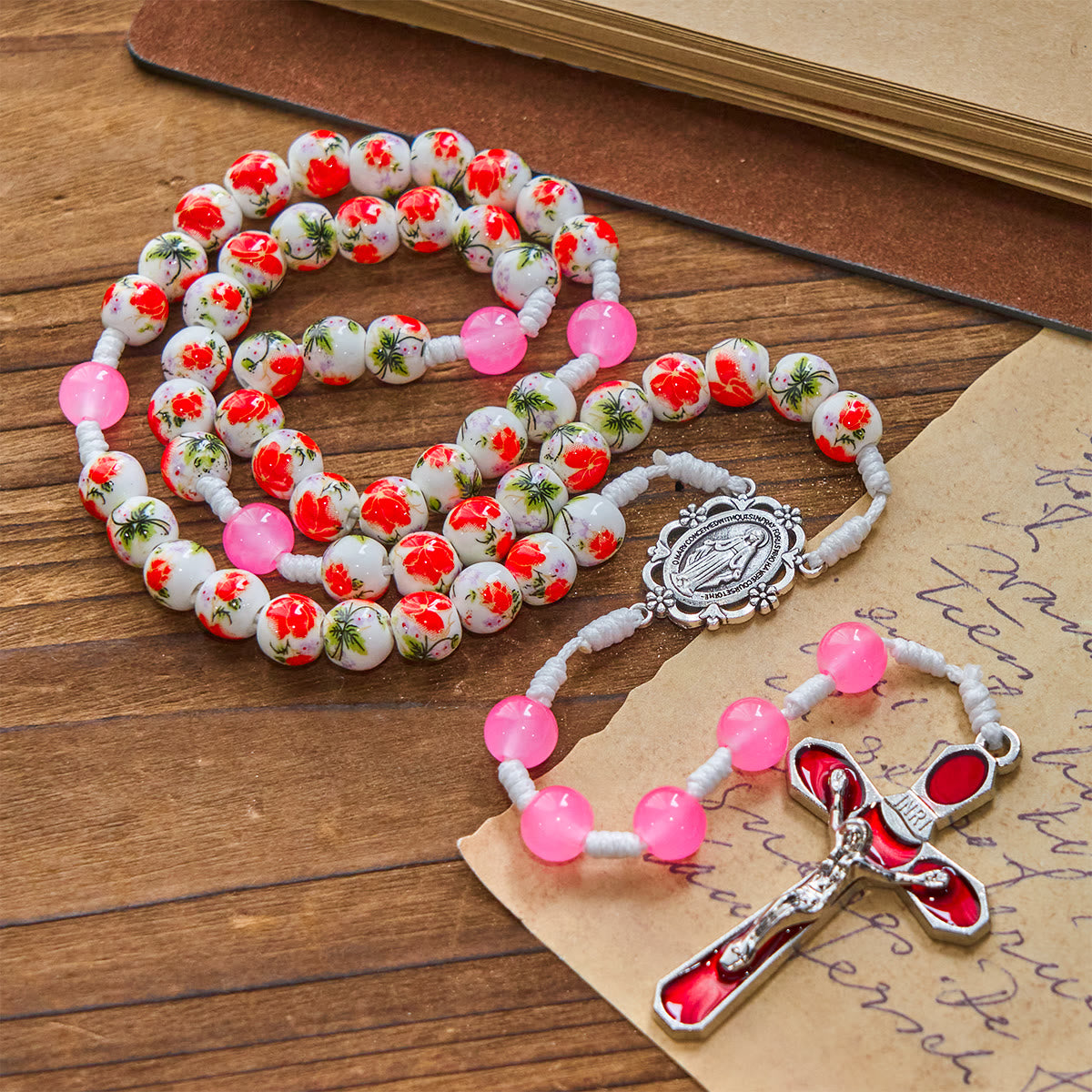 Il rosario con grani rotondi da 8 mm, raffigurante la Medaglia Miracolosa e il Crocifisso in smalto rosso, fonde il fascino floreale con la fede sacra. I suoi grani vivaci e i dettagli dettagliati onorano la devozione spirituale, perfetto per i credenti.