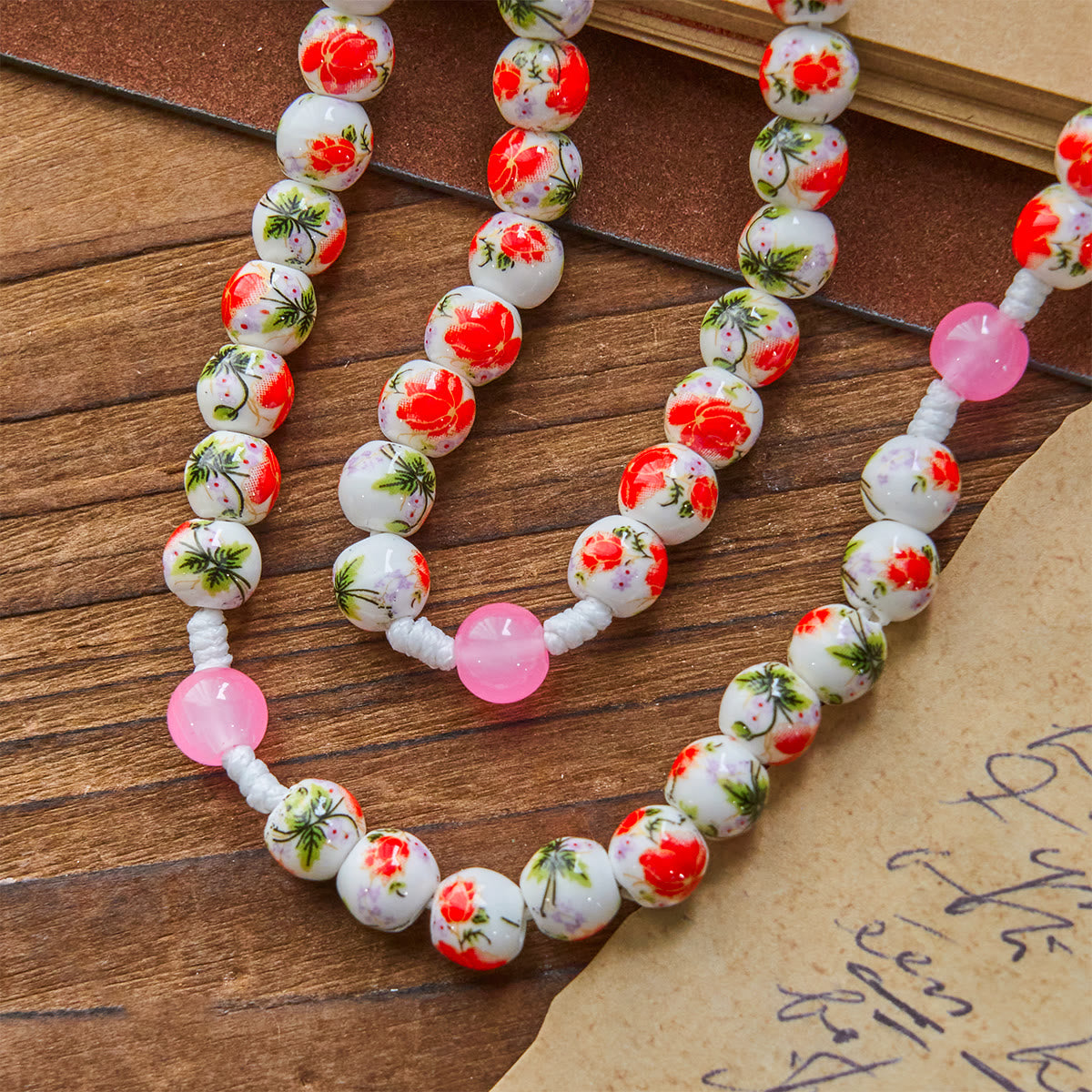 Perline da 8 mm con motivo floreale, infilate con cura, si abbinano a ciondoli in argento e smalto rosso. Ogni perla e ogni simbolo riflettono un'accurata lavorazione artigianale, creando un accessorio delicato e carico di fede.