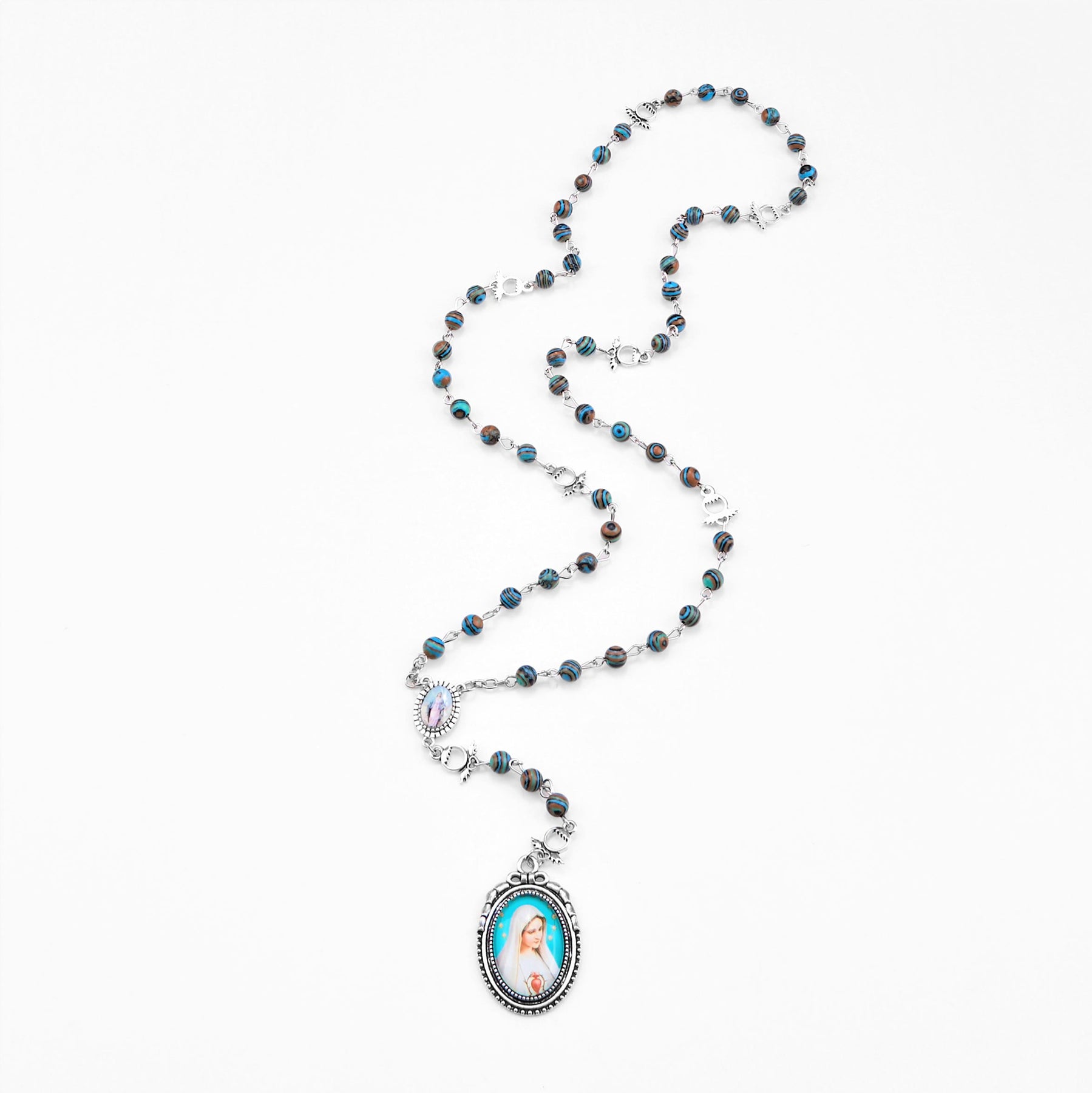 Rosario con catena in lega di malachite verde rotonda da 6 mm e medaglia miracolosa e crocifisso
