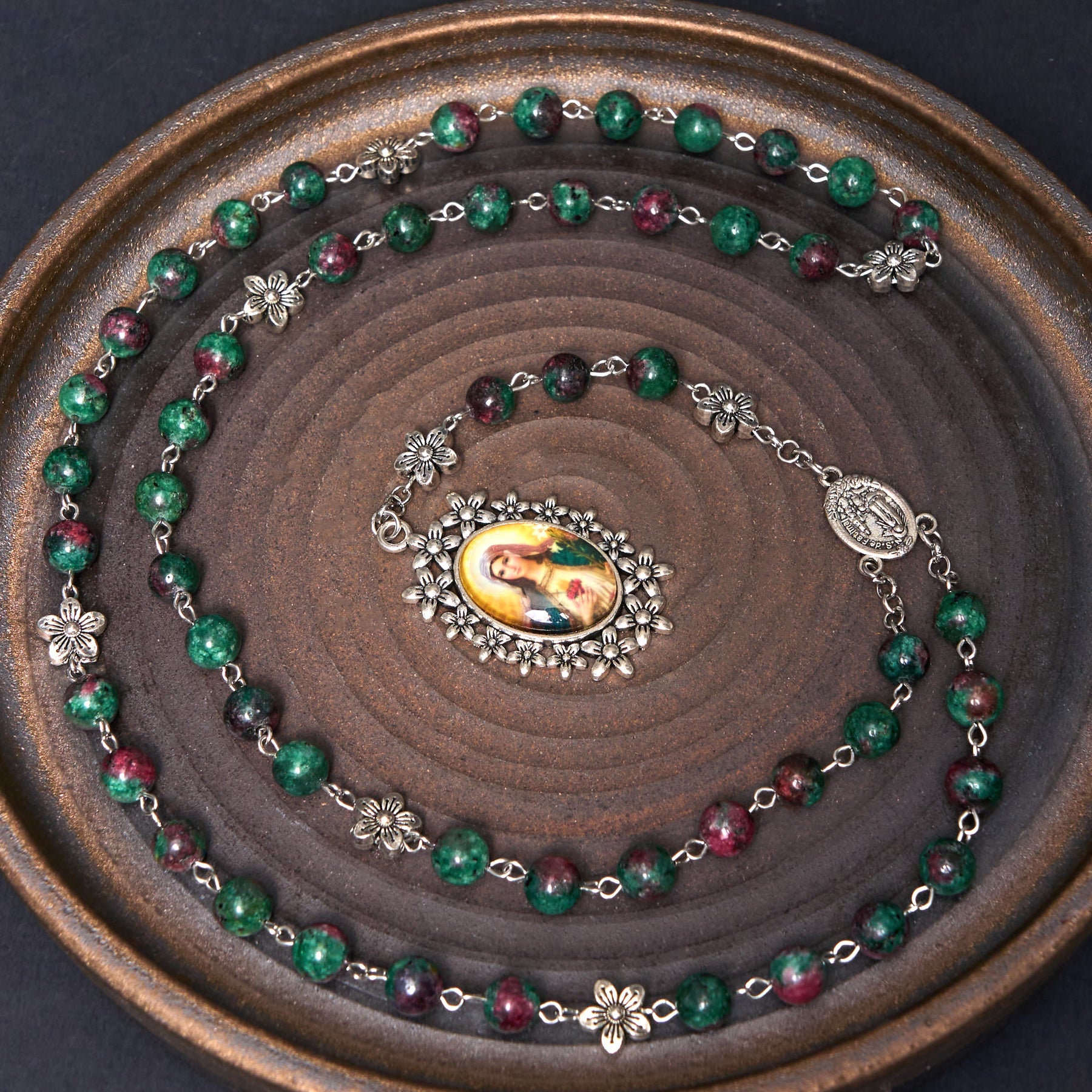 Lascia che il tocco fresco di questi grani ti guidi in ogni preghiera, aiutandoti a trovare tranquillità e concentrazione. Questo rosario è più di un semplice strumento devozionale: è una presenza confortante che sostiene il tuo cammino verso la pace interiore e la connessione divina. - Regalo perfetto per i devoti