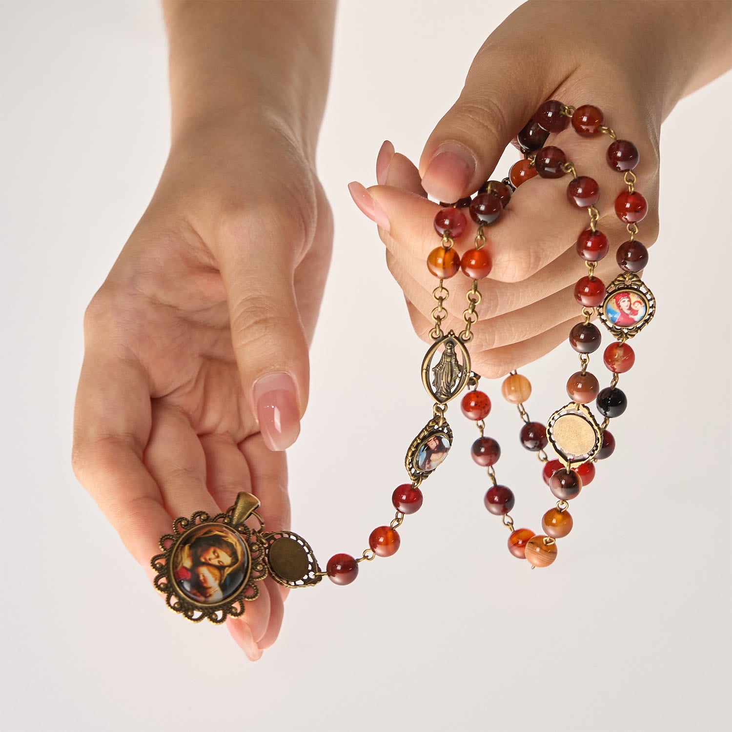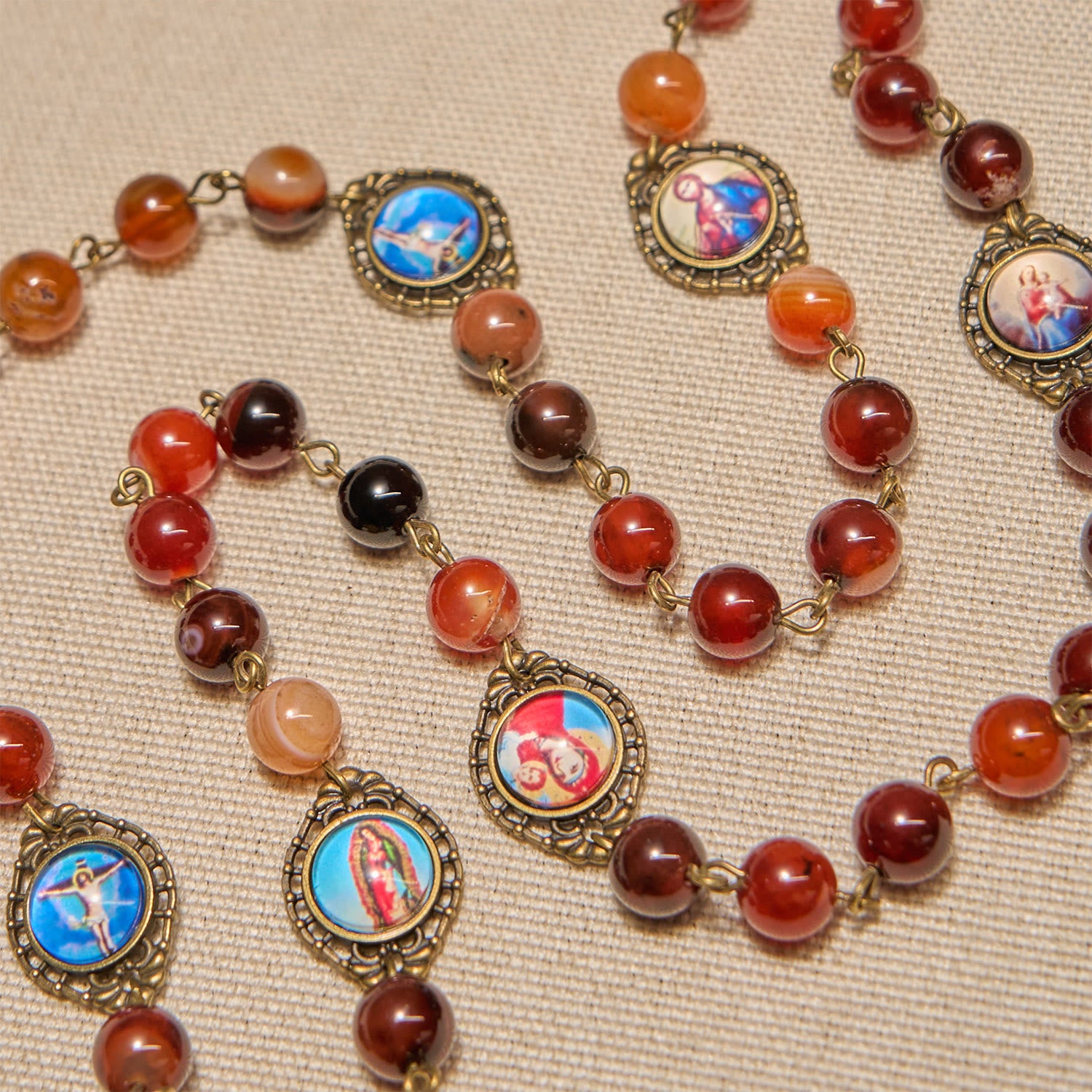 Indossati quotidianamente, le delicate tonalità dell'agata e gli emblemi sacri infondono ai momenti una grazia silenziosa: una fede tanto serena quanto luminosa.