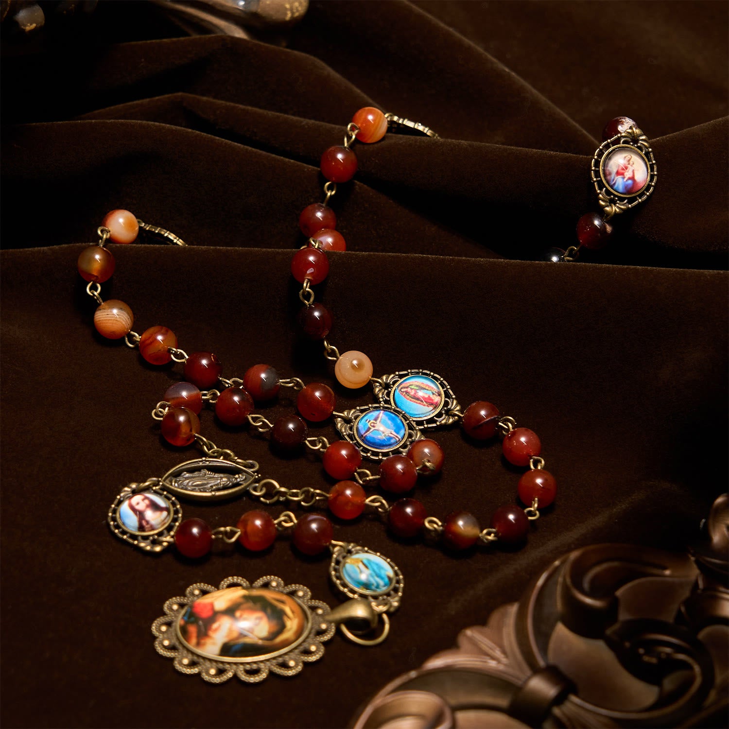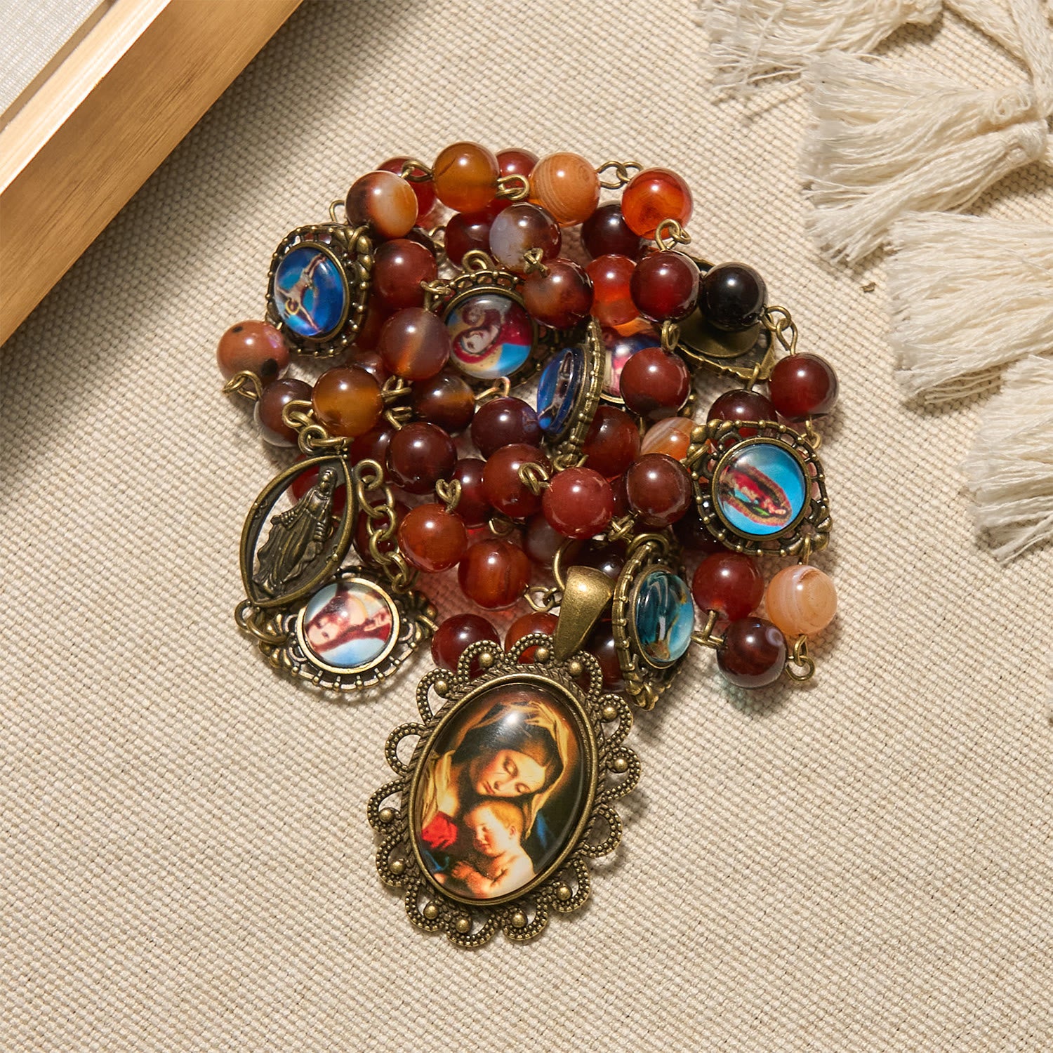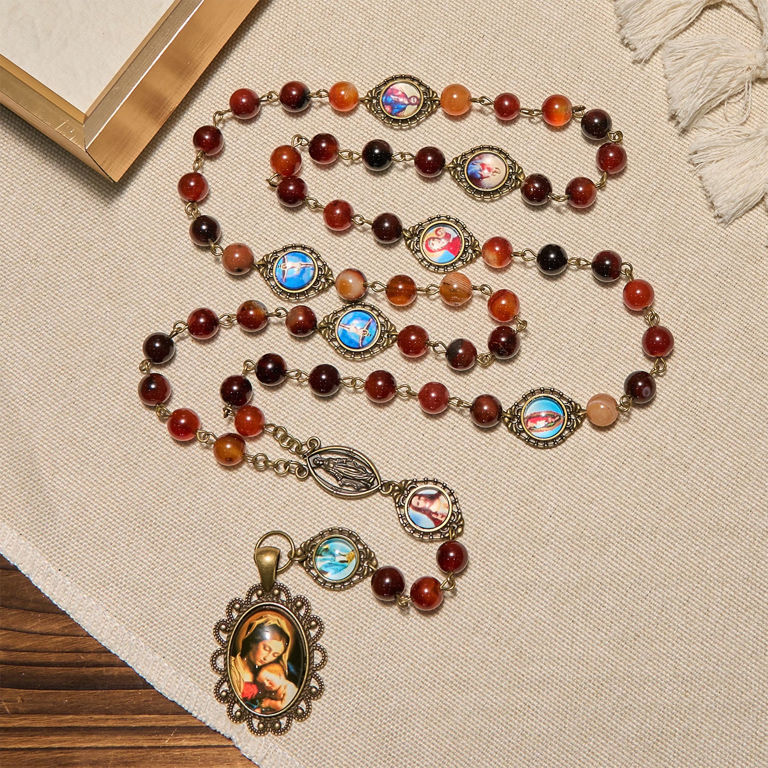 Medaglia della Madonna Christianartworkshop e rosario con perle di agata marrone sognante e simboli dei santi