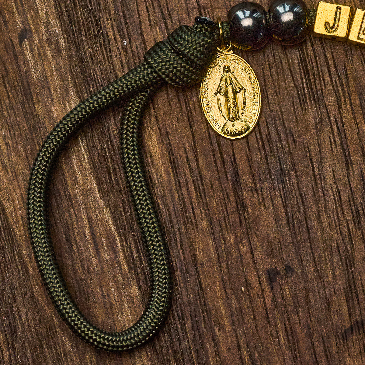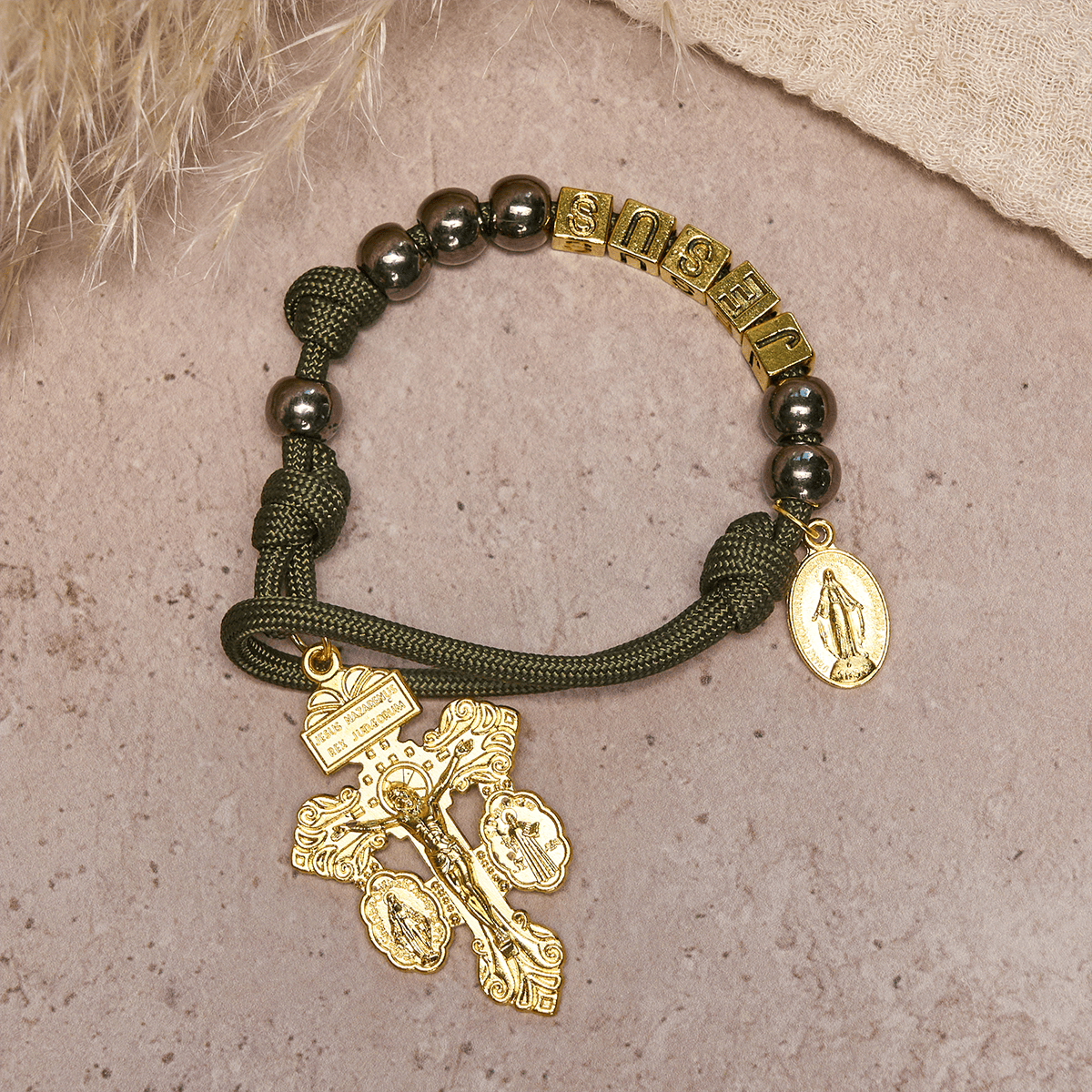 Questo rosario compatto con cordino tascabile abbina nodi pronti all'uso a perline in stile ematite e dettagli in oro brillante. I cubi con le lettere di GESÙ posizionano il Santo Nome esattamente dove lo tieni in mano e lo preghi. -
