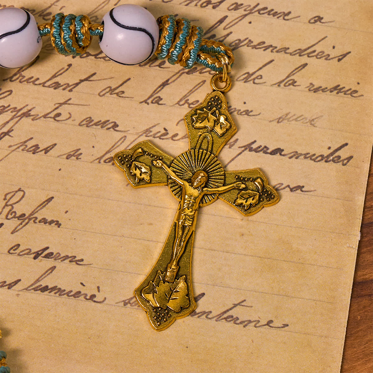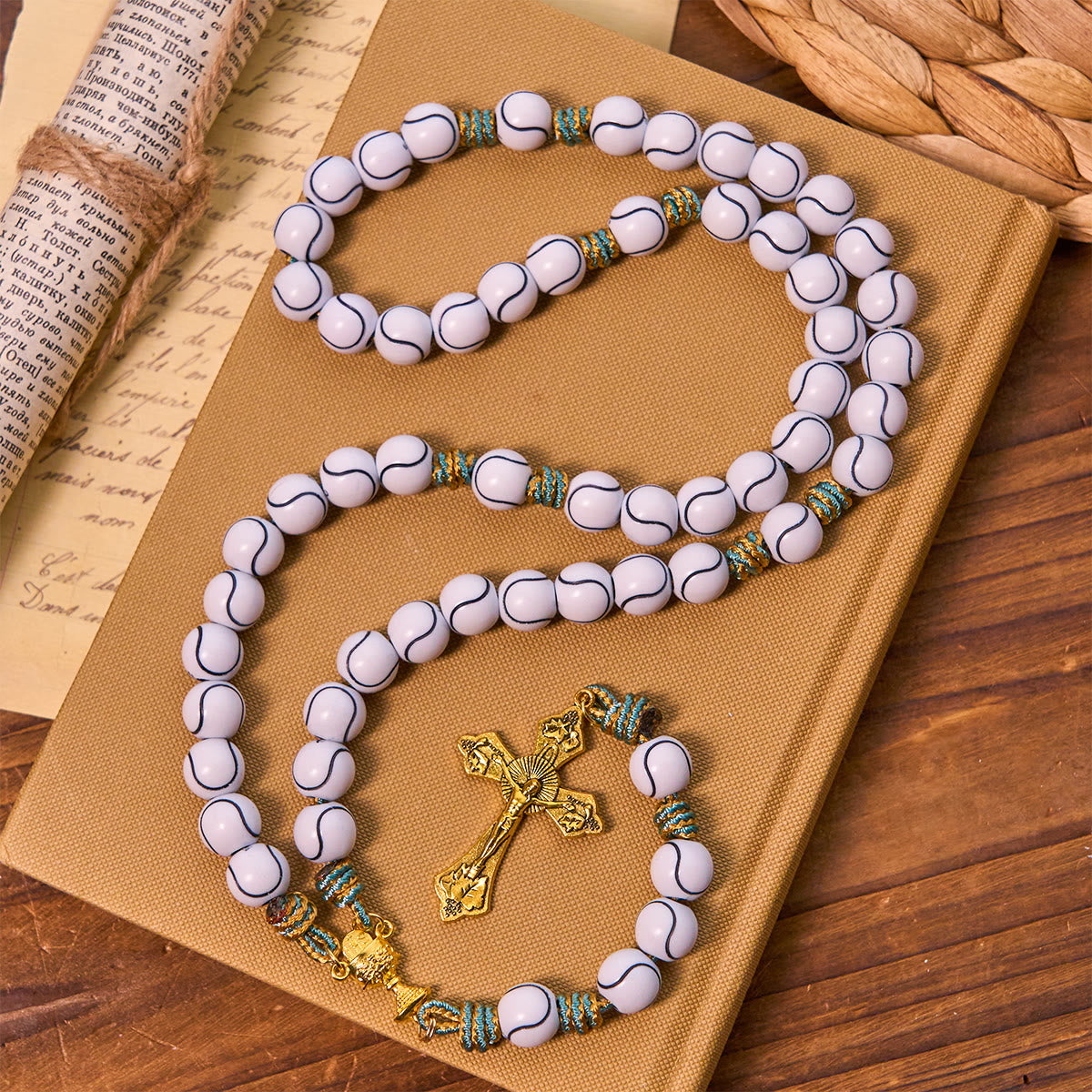 Questo rosario unisce l'ispirazione sportiva a un profondo significato spirituale. Il crocifisso dorato evoca il sacrificio di Cristo, mentre i grani a forma di palla da tennis celebrano l'amore per lo sport, rendendo la preghiera un vibrante mix di devozione e passione.