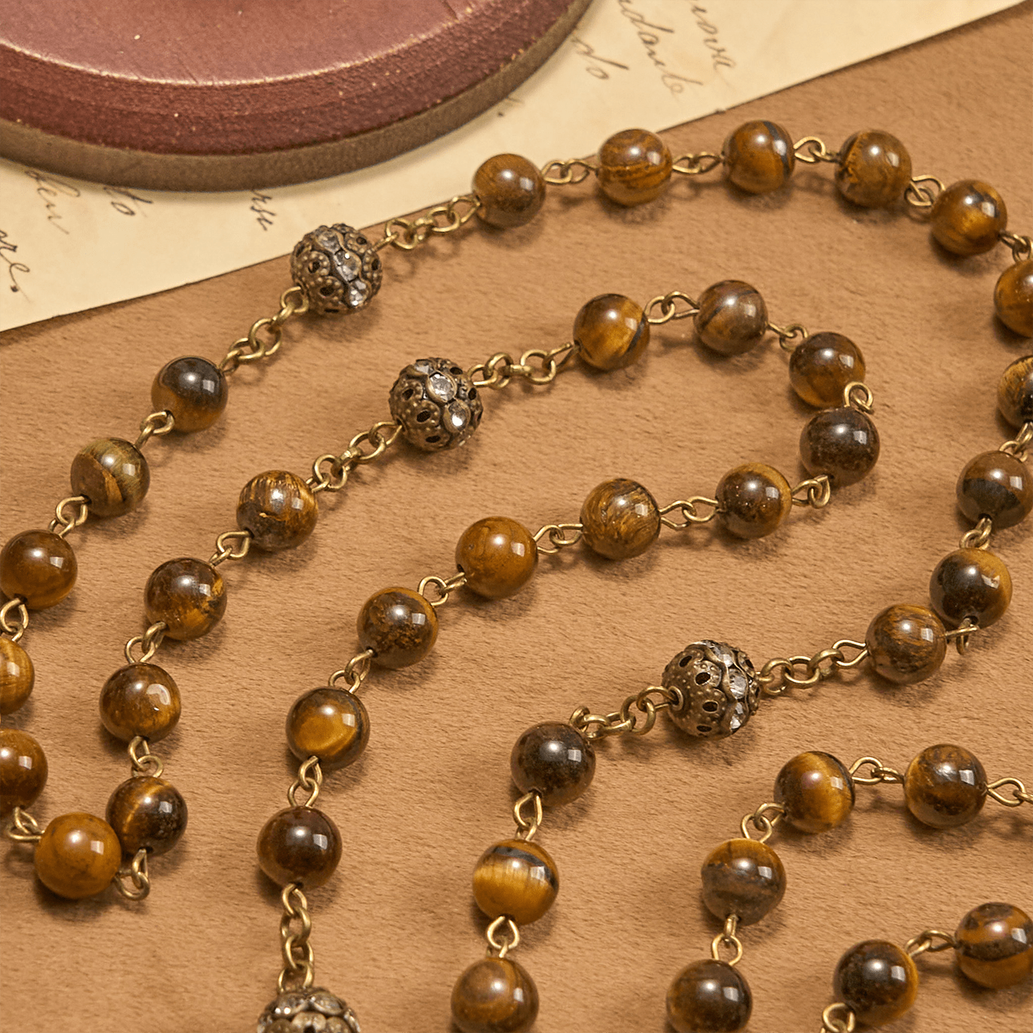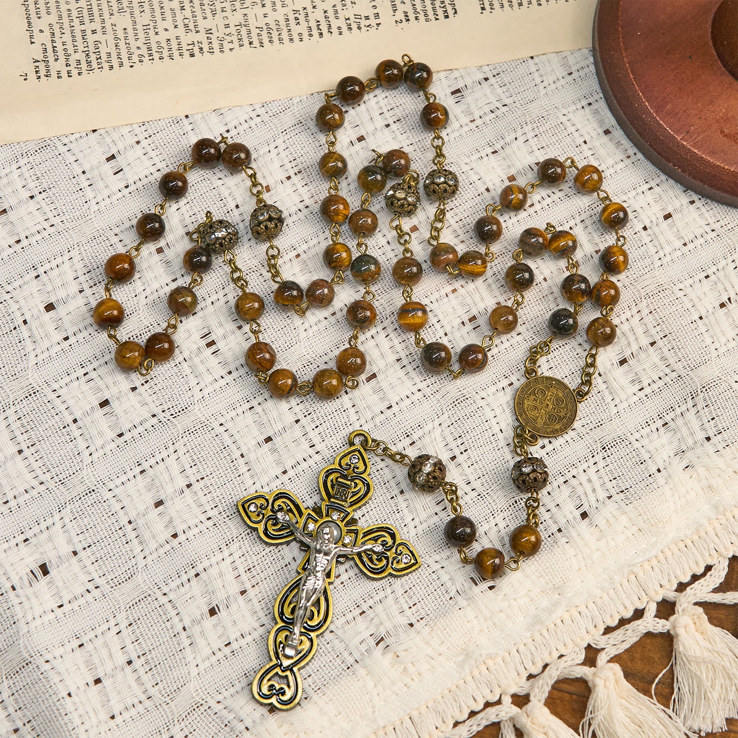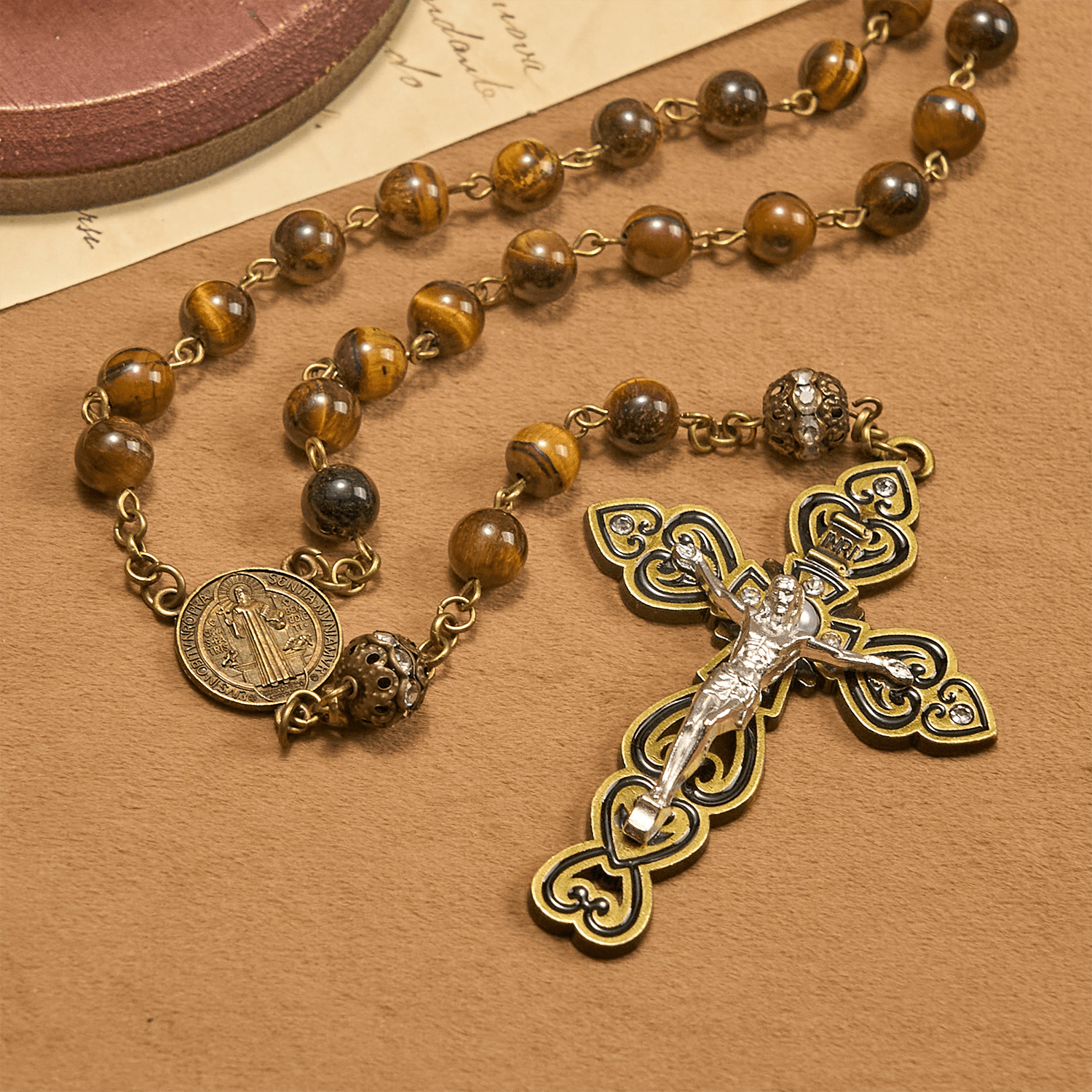 Le audaci perle di occhio di tigre brillano con fasce dorate, infilate accanto a una calda medaglia di bronzo di San Benedetto e a un crocifisso: uno scudo divino per l'anima fedele. - Armatura naturale, Guardia divina