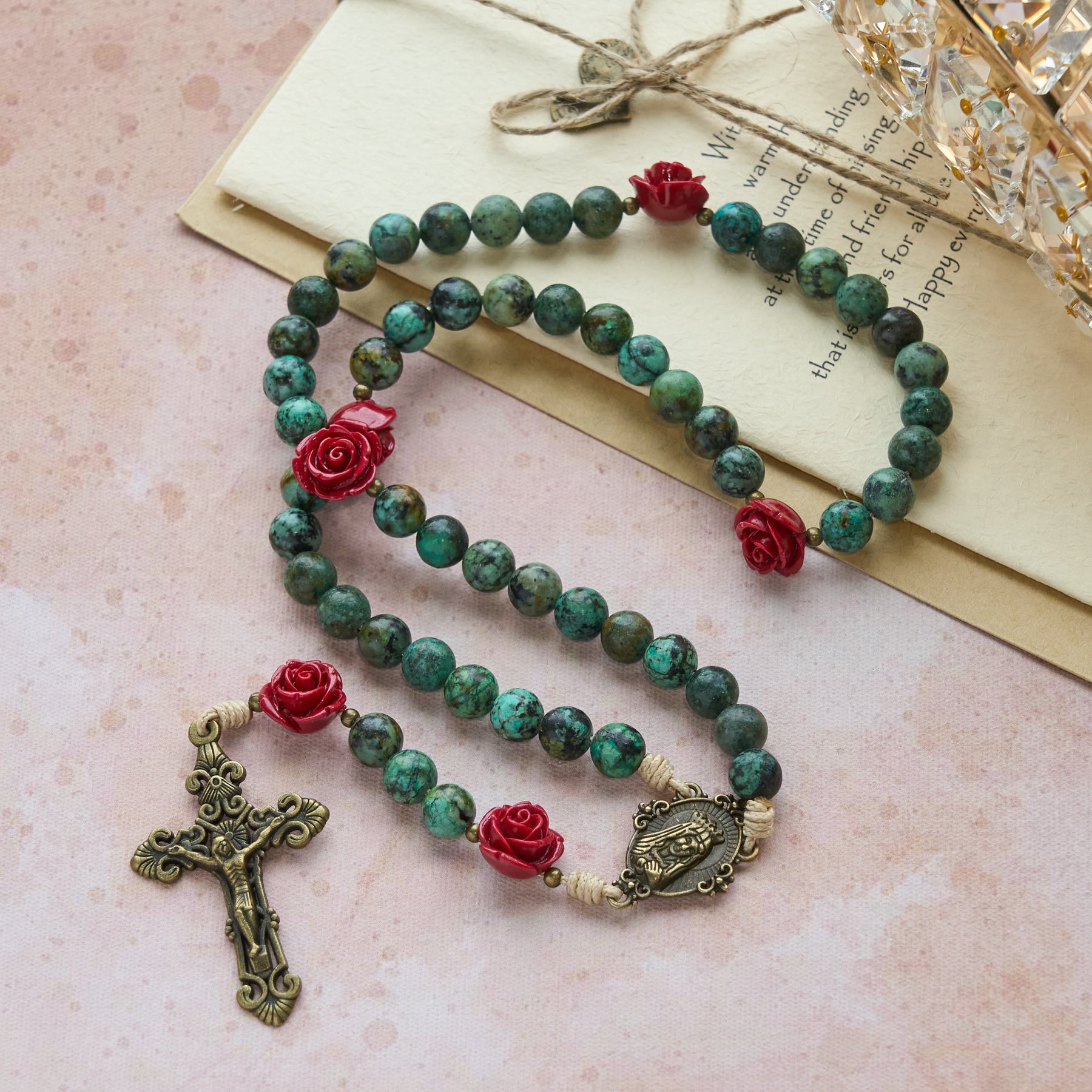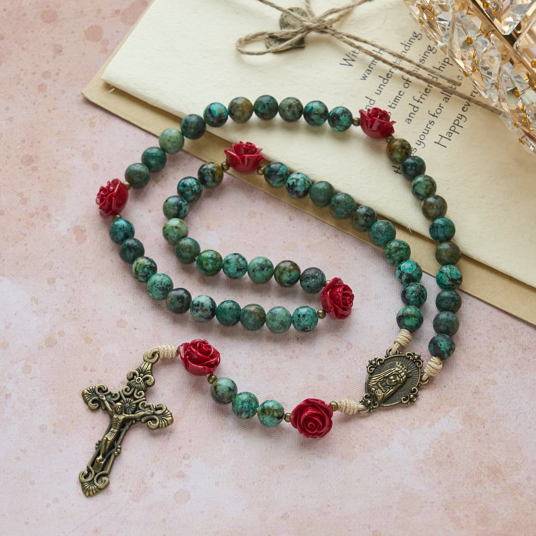 Questo rosario è una delicata testimonianza di devozione: una collana di grani di preghiera che avvicina il cuore a Dio. Ogni perla di turchese africano e ogni dettaglio di rosa rossa risuonano di significato spirituale, esortando l'anima a dimorare nell'amore, nella fiducia e nella grazia divina. - Crocifisso e simbolo mariano della fede