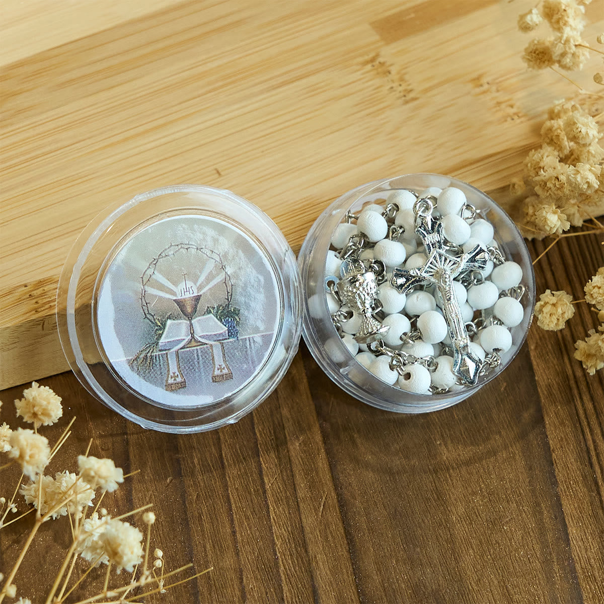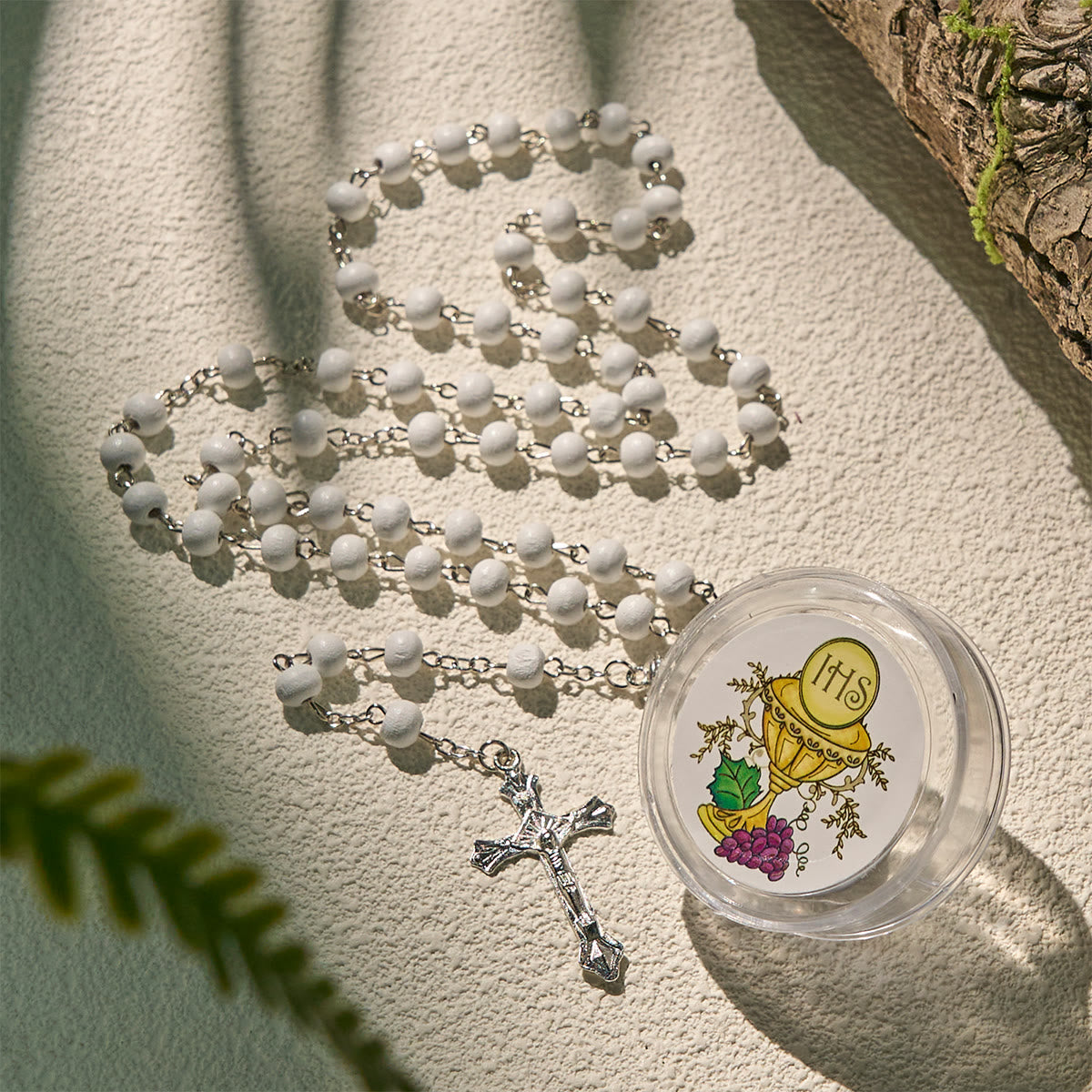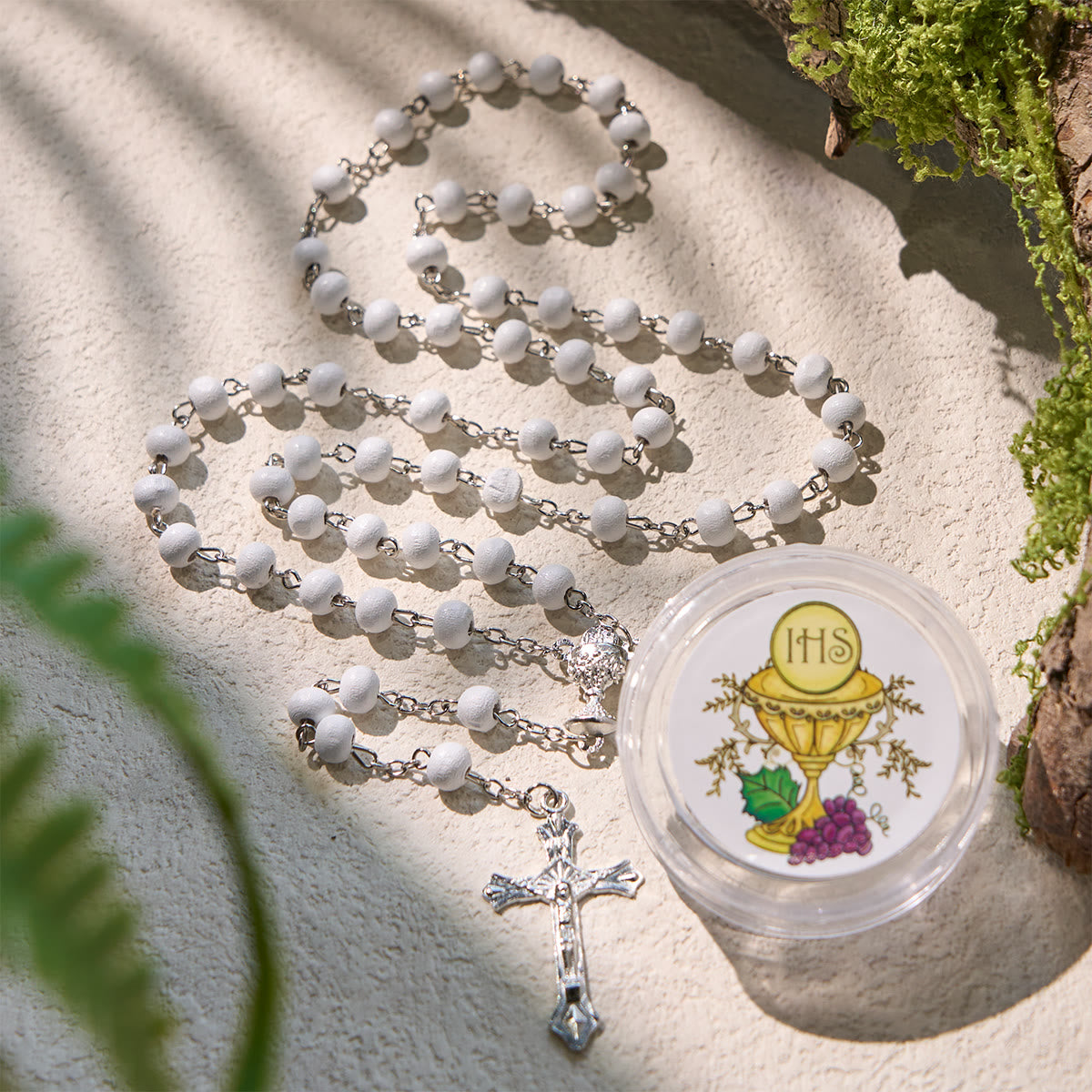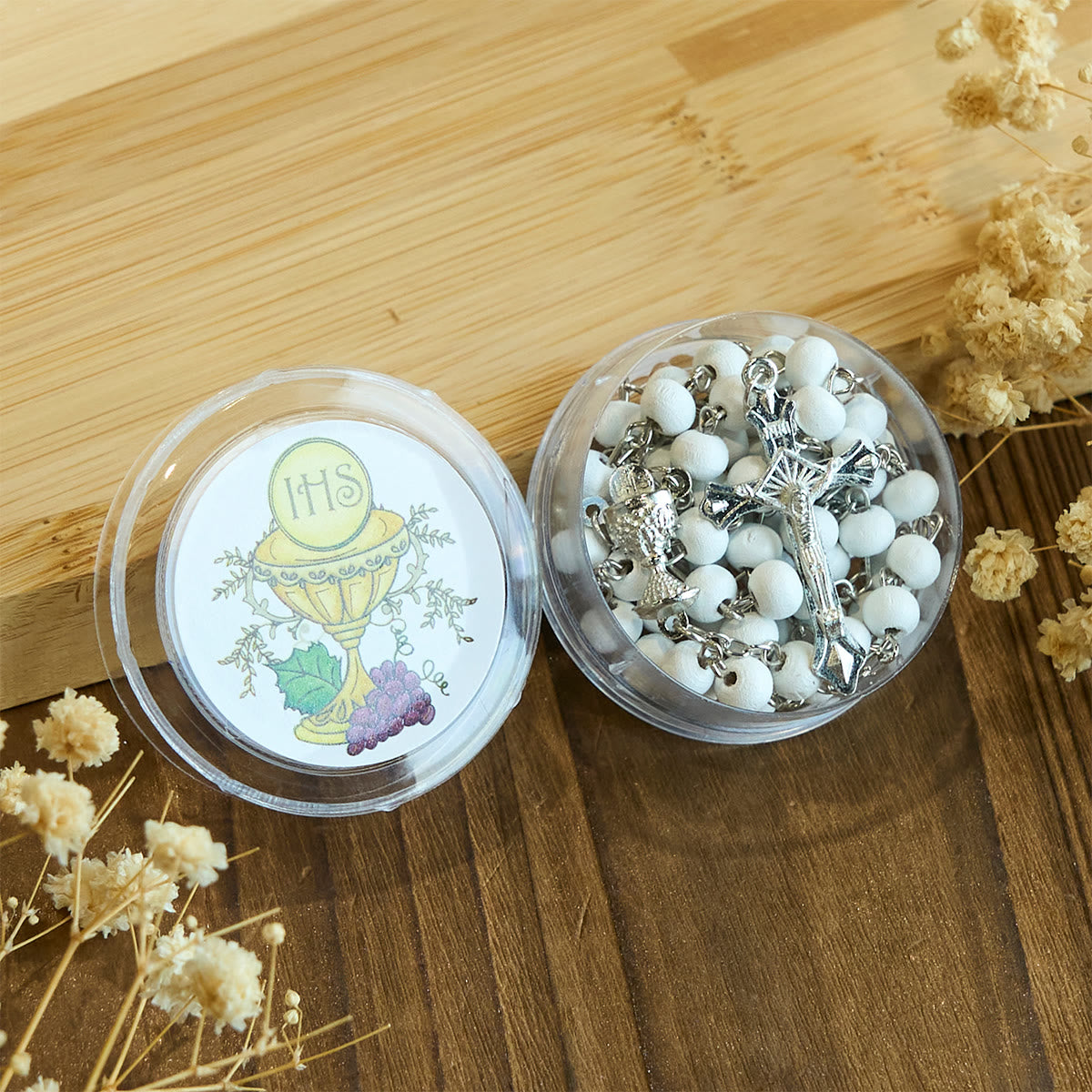Rosario per la Comunione in legno divino con calice sacro, colore bianco, con confezione regalo