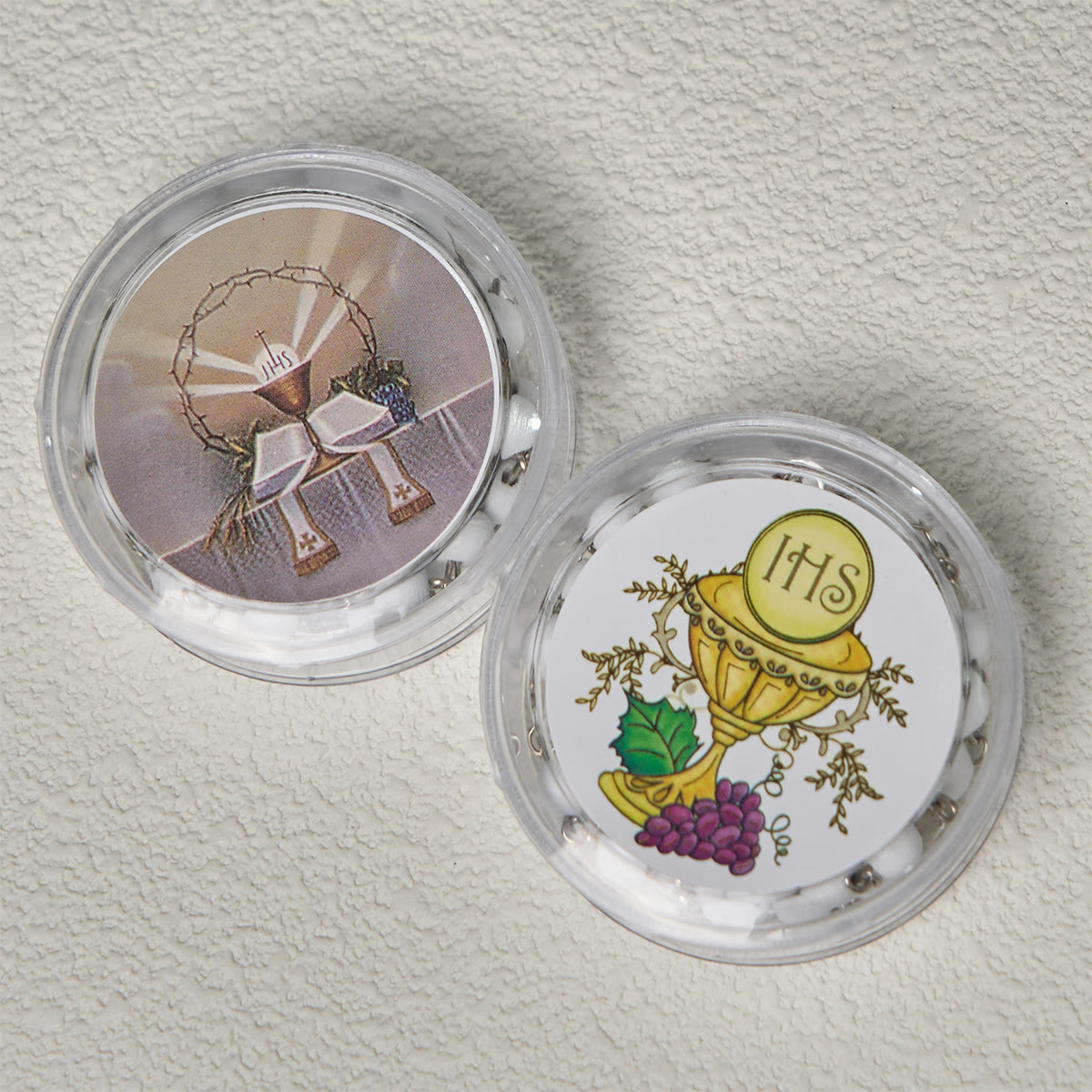 Ogni rosario è corredato, a scelta, da un astuccio per calice sacro IHS o da un astuccio per calice battesimale, entrambi decorati con immagini religiose significative.