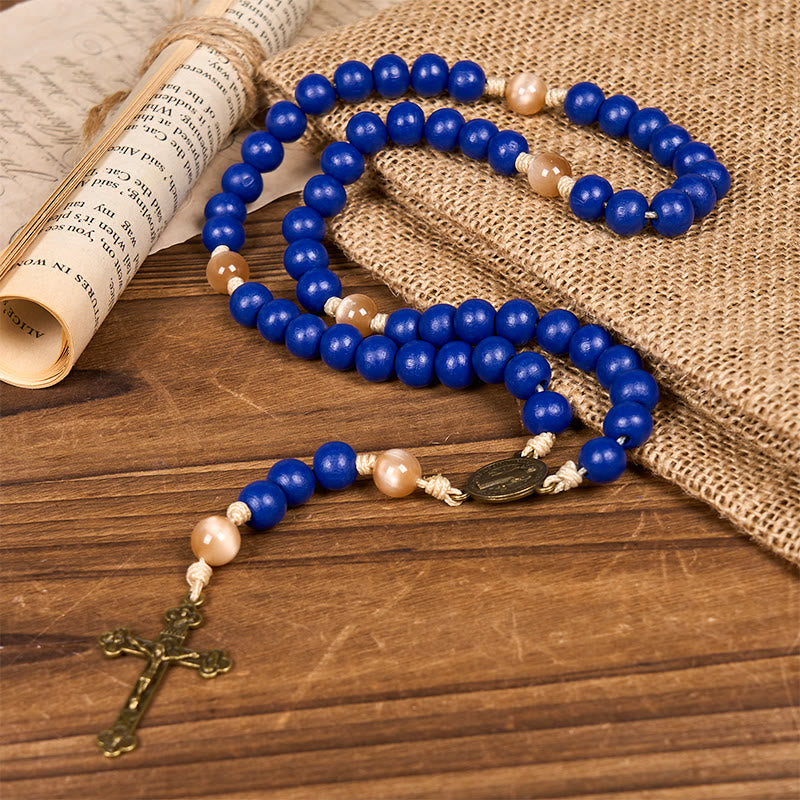Immergiti nelle profondità della tua fede con il rosario "Oceano di Fede". Realizzato a mano con grani di legno blu intenso e distanziatori in pietra occhio di gatto marrone, questo rosario incarna il profondo e sacro legame con Cristo. La ricca tonalità blu simboleggia la vastità del Suo amore e la grazia infinita che Egli offre, mentre le pietre preziose marroni rappresentano la forza radicante delle Sue promesse. - Realizzato con semplicità e riverenza