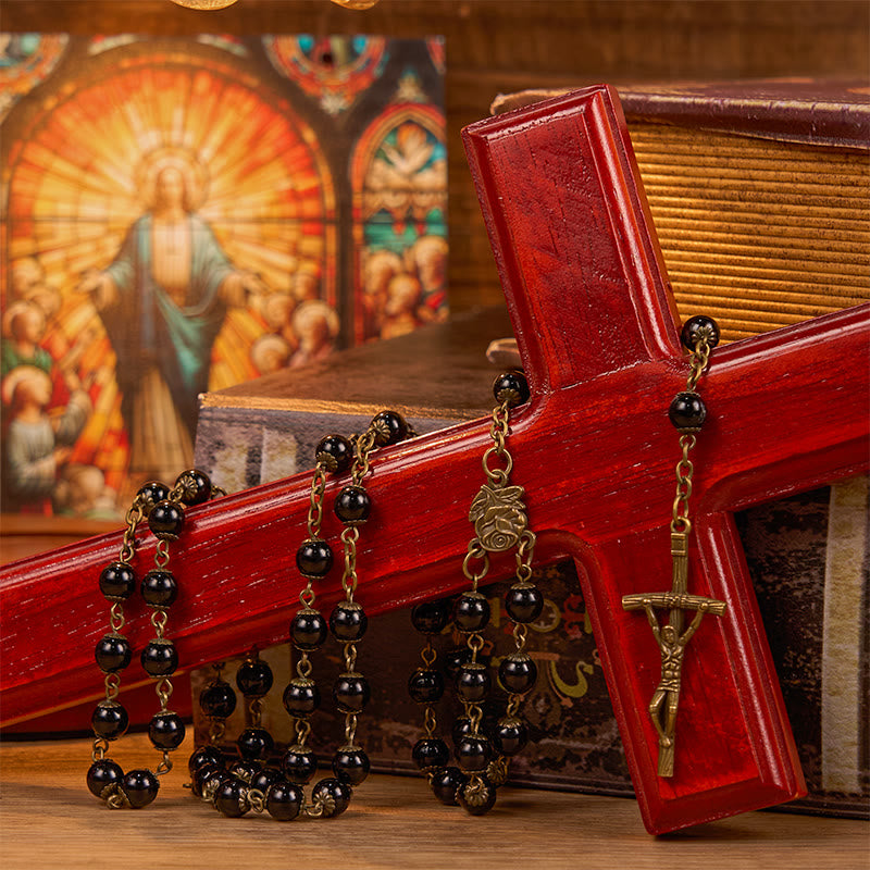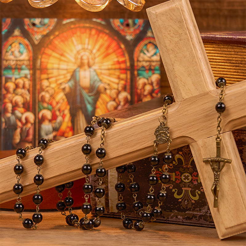 Gli eleganti grani del rosario nero non sono solo un oggetto devozionale, ma un prezioso compagno nel tuo cammino spirituale. Ogni grano rappresenta un momento di riflessione e connessione con Dio, rendendo le tue preghiere più profonde e significative.
