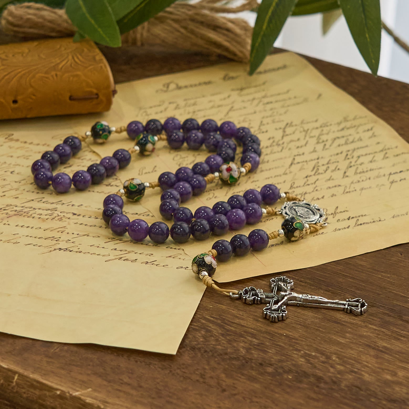 Rosario in agata viola e perle cloisonné con medaglia della Vergine Maria e crocifisso: senti la devozione della grazia