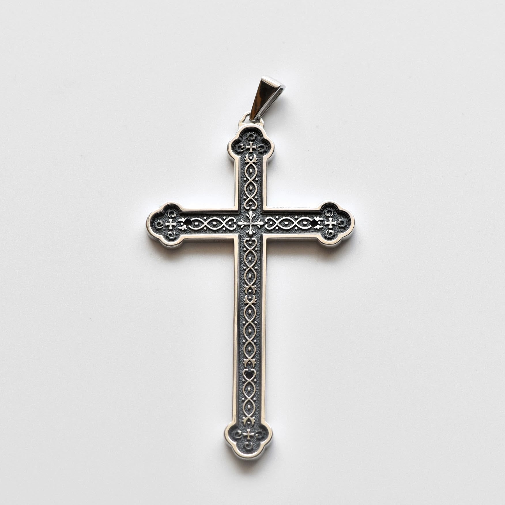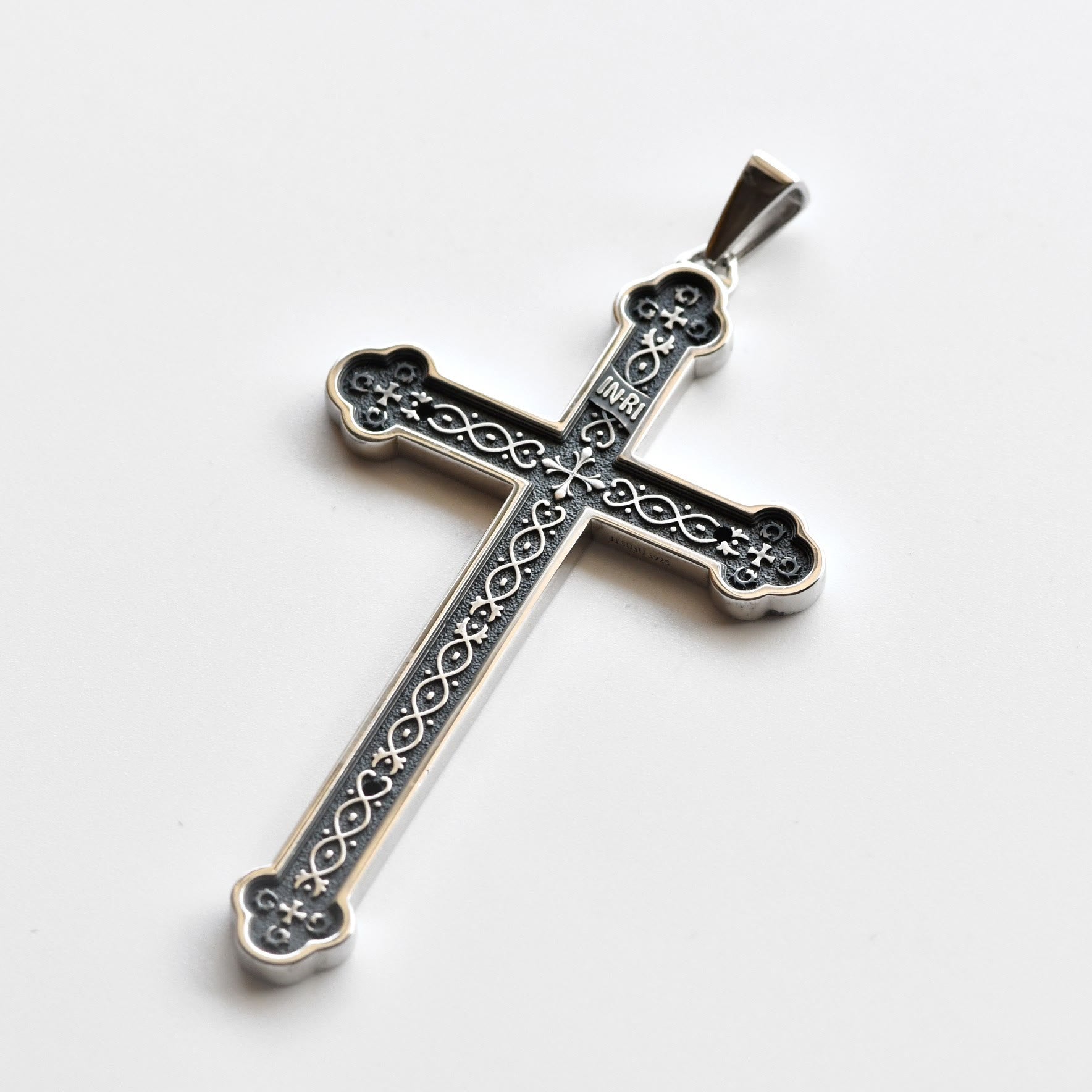 Una croce retrò in argento sterling reca l'iscrizione INRI: lettere consumate dal tempo che sussurrano il sacrificio sovrano di Cristo. Forgiata come una testimonianza tattile di fede duratura. - Sterling Patina, Eternal Echo