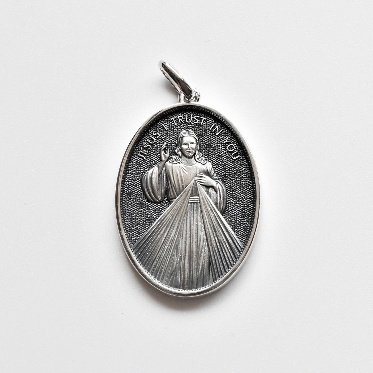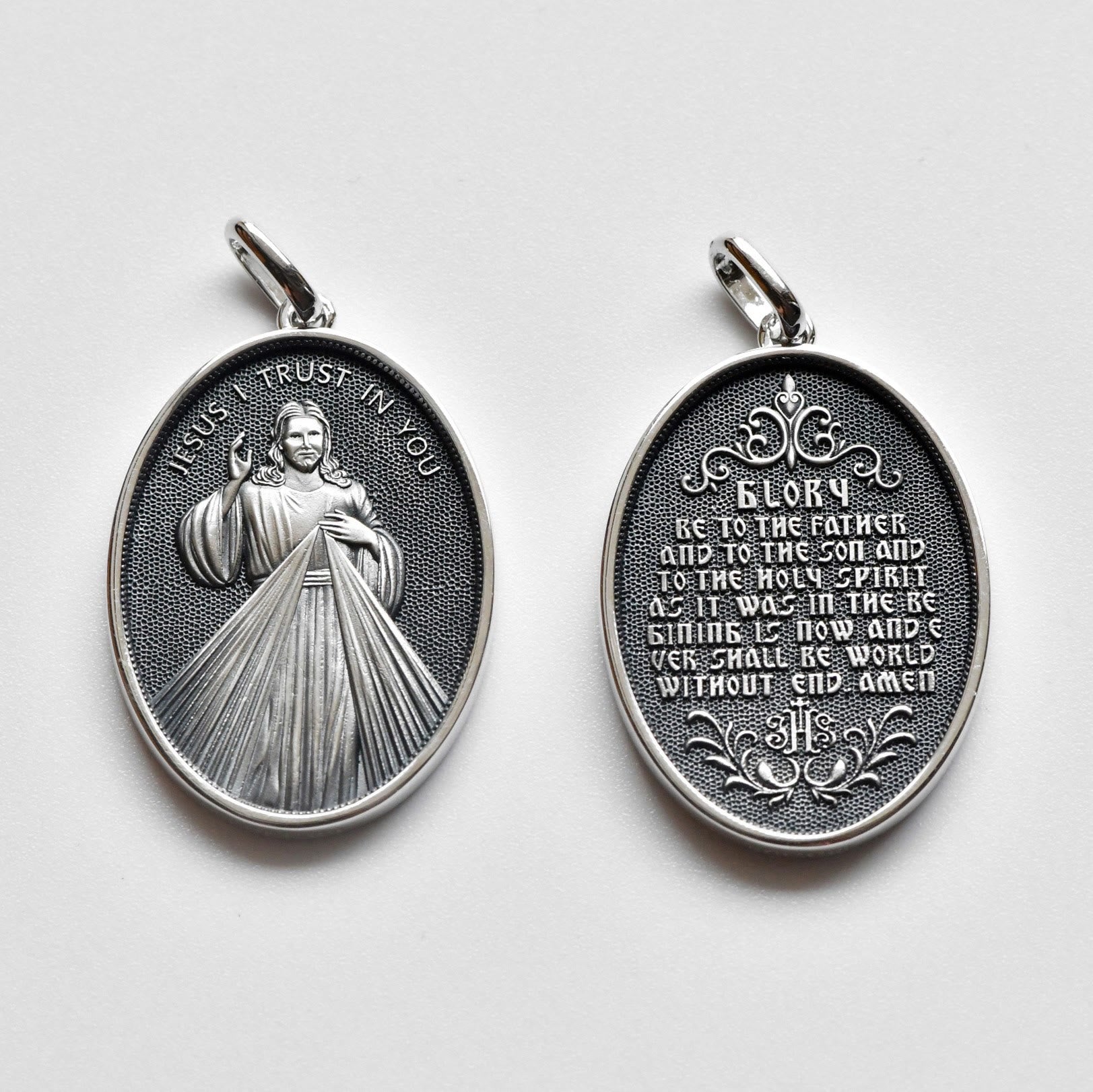 Collana con medaglia ovale antica in argento sterling raffigurante Gesù della Divina Misericordia