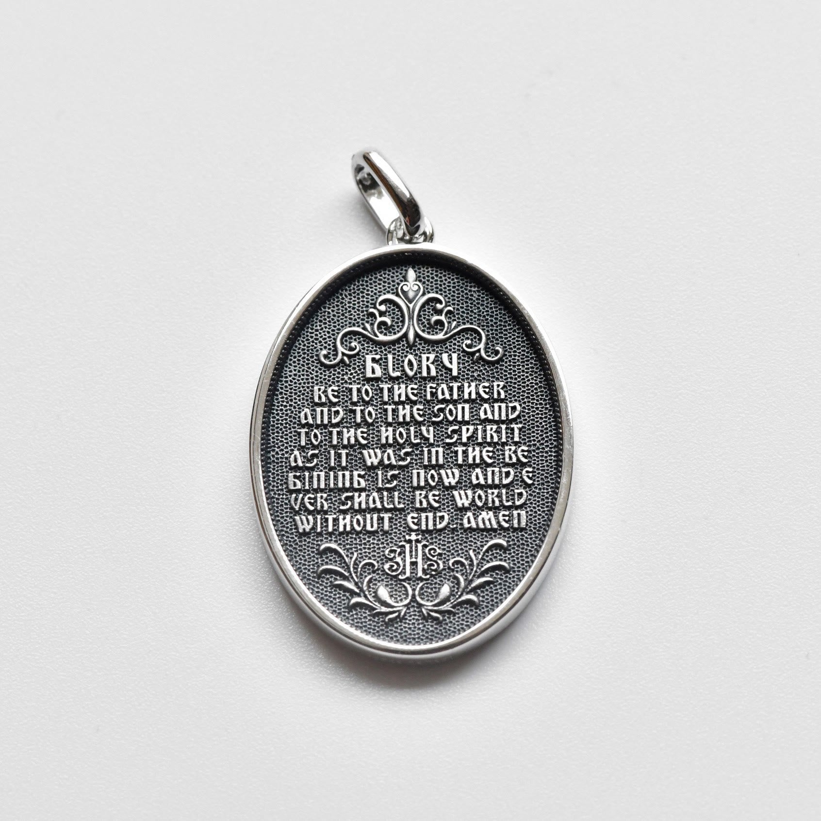 Una medaglia ovale in argento sterling in stile antico risplende con Gesù della Divina Misericordia, la sua mano benedicente e i raggi sacri che scorrono, forgiata in argento senza tempo come un faro di speranza e perdono. - Sterling Canvas, Promessa Eterna