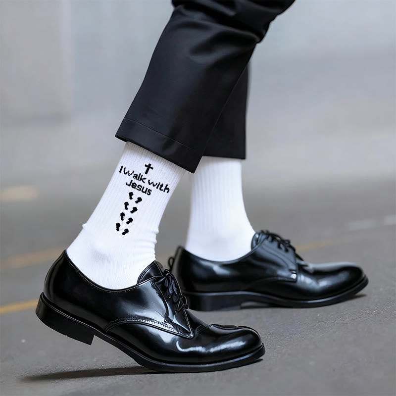 Questi calzini "Cammina con Gesù" sono più di semplici calzature: sono un riflesso di fede e un promemoria di compagnia spirituale. Con la scritta "Cammina con Gesù", una croce e le impronte dei piedi, ogni passo che fai sembra un viaggio nella fede. - Conforto unito alla fede