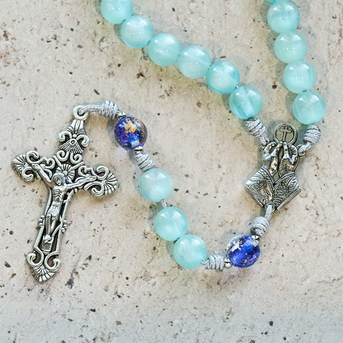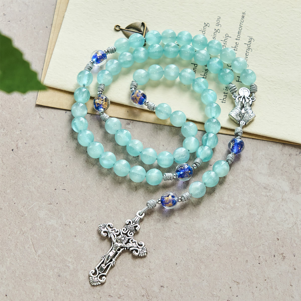 Questo rosario ciano Aqua Starlight UV-Color Shift avvolge la devozione in una meraviglia che reagisce alla luce. I morbidi grani ciano virano al blu intenso sotto la luce UV, rispecchiando il modo in cui la grazia di Cristo trasforma i momenti ordinari, il tutto ancorato alla croce di Cristo ornata, che lega il cambiamento di colore di ogni grano al Suo amore onnipresente. - Devozione sensibile alla luce in ogni perla