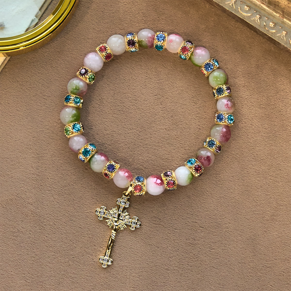 Questo bracciale devozionale scintillante in tormalina avvolge la fede in un fascino radioso. Le perle di tormalina rosa-verde (che riecheggiano la bellezza della creazione di Dio) brillano con accenti colorati, mentre l'ornato crocifisso dorato ancora ogni momento, legando ogni bagliore all'amore infinito di Cristo. - Fede indossabile in ogni luccichio