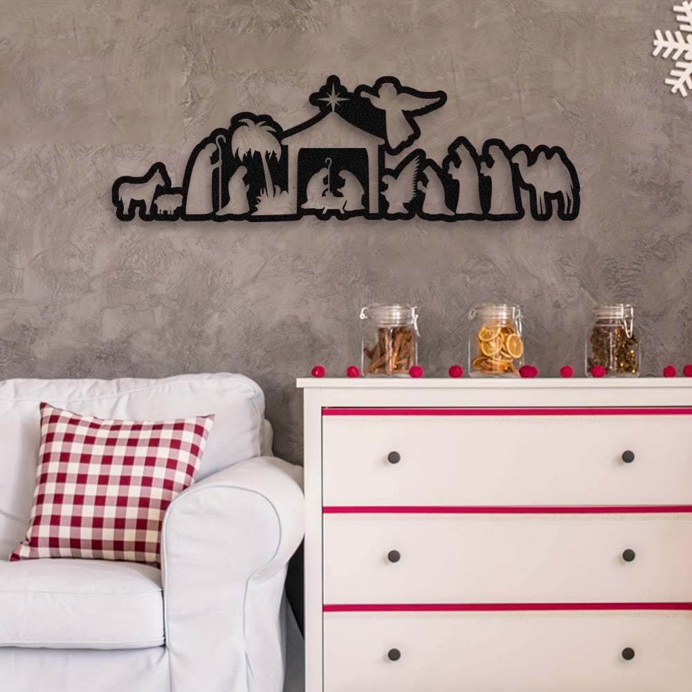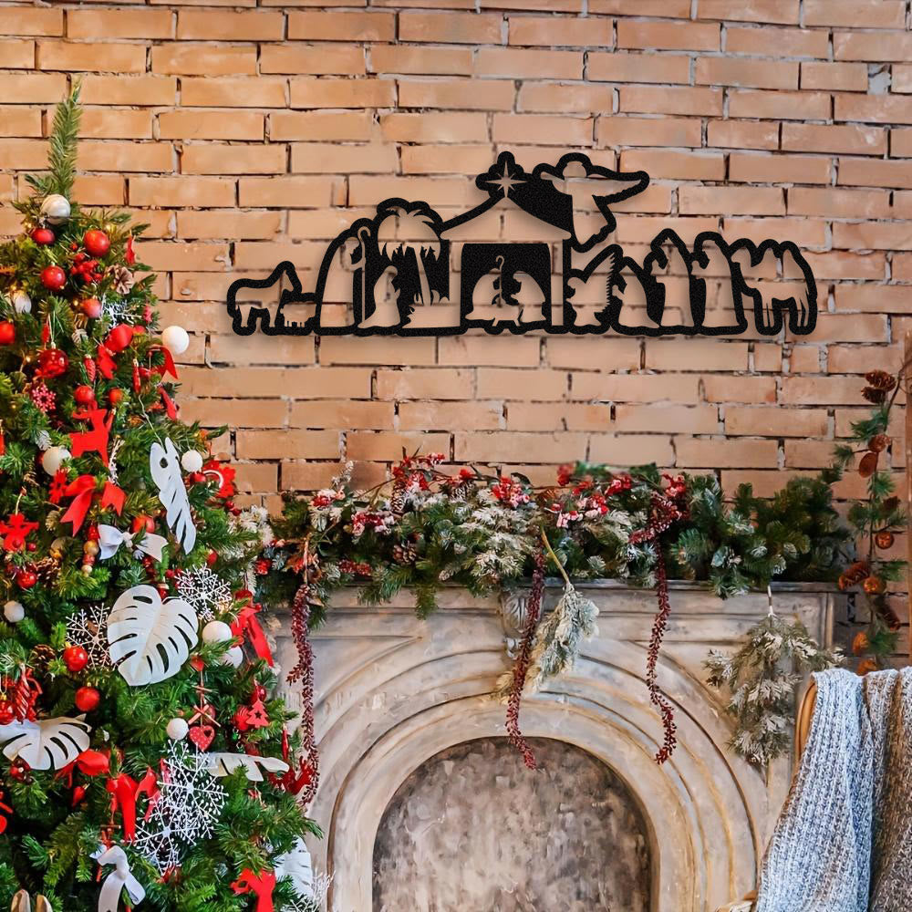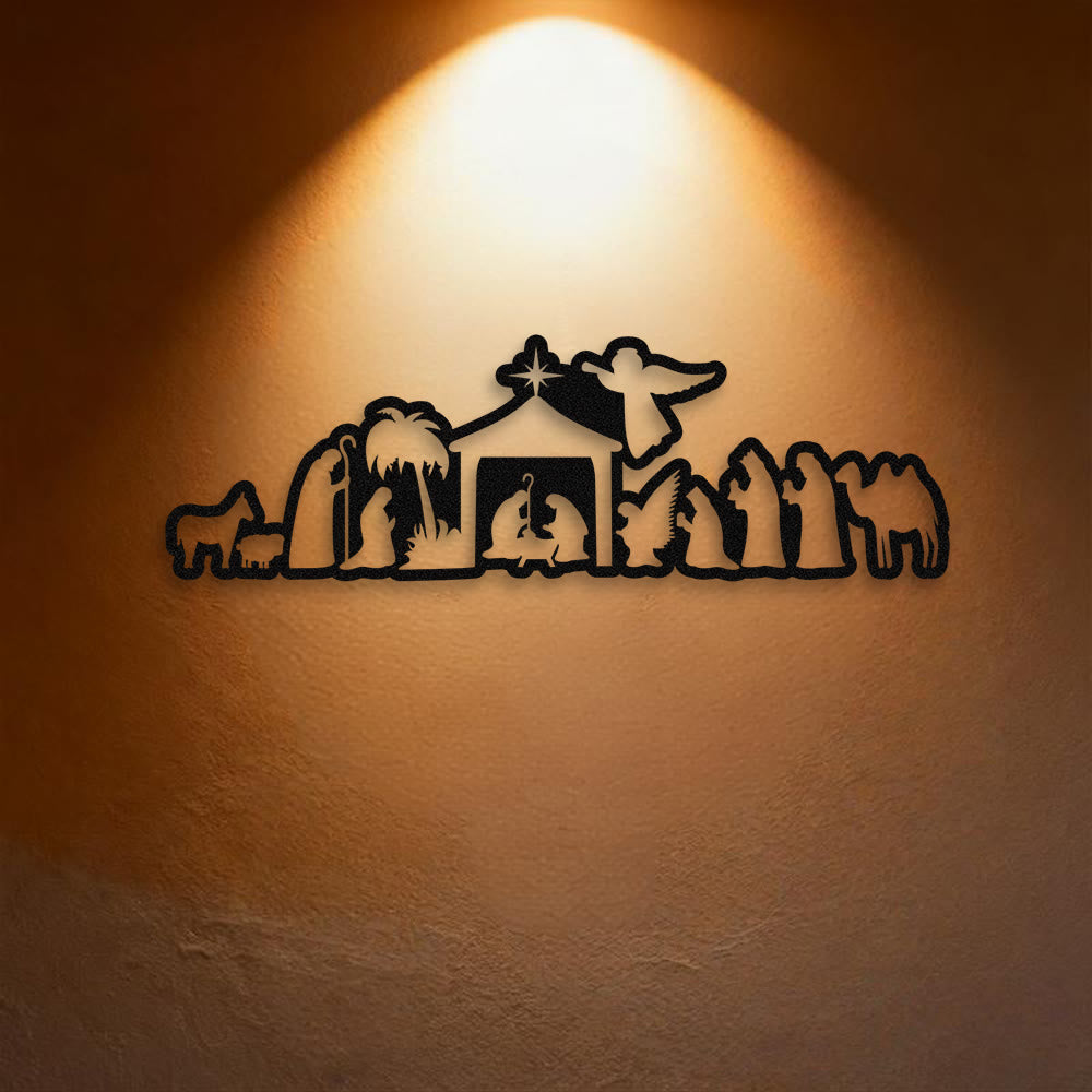 Caratterizzata da una silhouette dettagliata della natività, con la Sacra Famiglia, gli angeli e i Re Magi, questa opera d'arte murale incarna la fede natalizia e la narrazione biblica, invitando a riflettere sulla nascita di Cristo nel tuo spazio. - Artigianato in metallo di precisione, devozione senza tempo