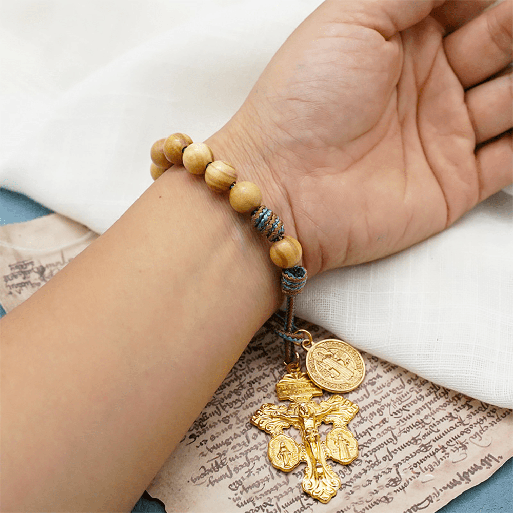 Medaglia di San Benedetto e crocifisso in legno d'ulivo dorato rotondo da 10 mm, rosario tascabile con cordino in nylon