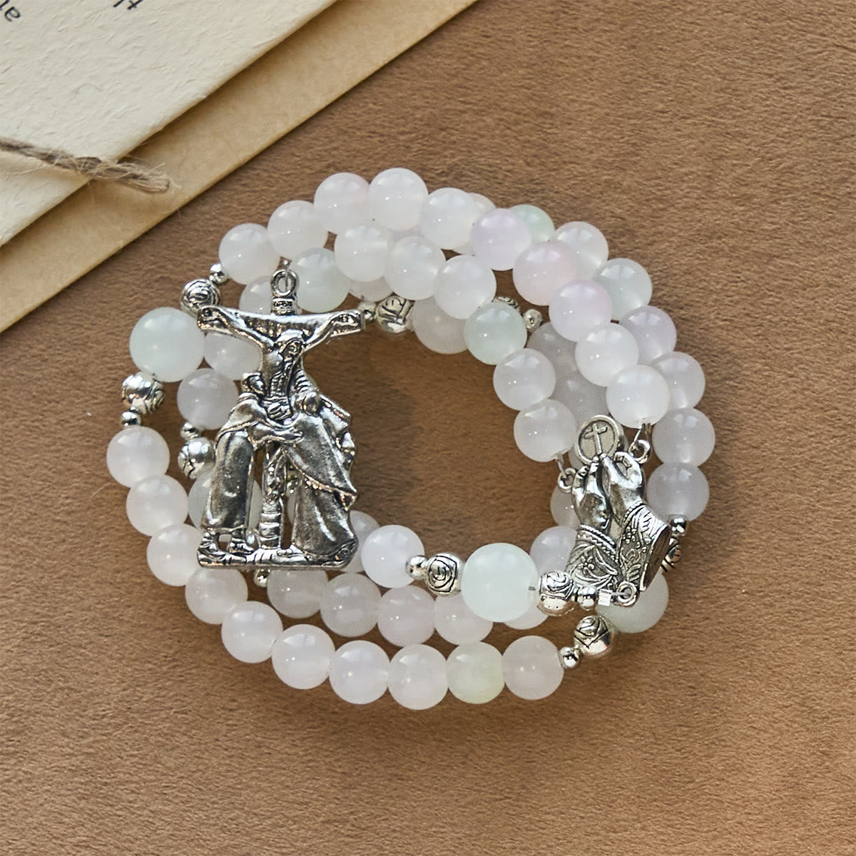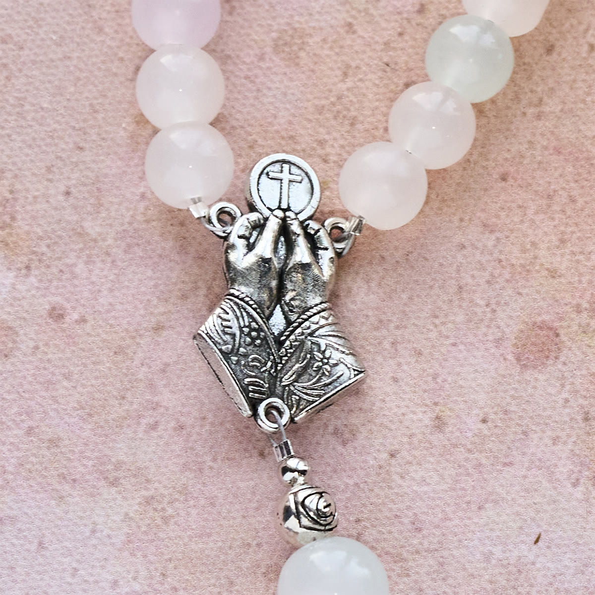Il crocifisso ancora il rosario all'amore sacrificale di Cristo, mentre le mani in preghiera incarnano la devozione, la resa e la comunione quotidiana con Dio. Quando i grani brillano all'esterno, offrono un promemoria visivo che anche la fede diventa più radiosa quando viene portata alla luce. - Tonalità delicate, riflessi profondi